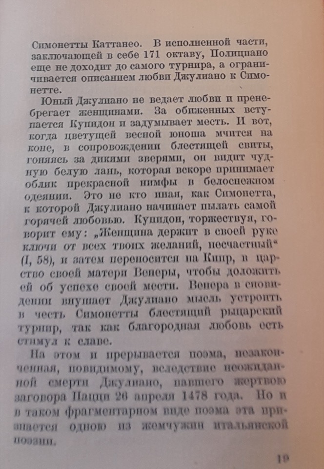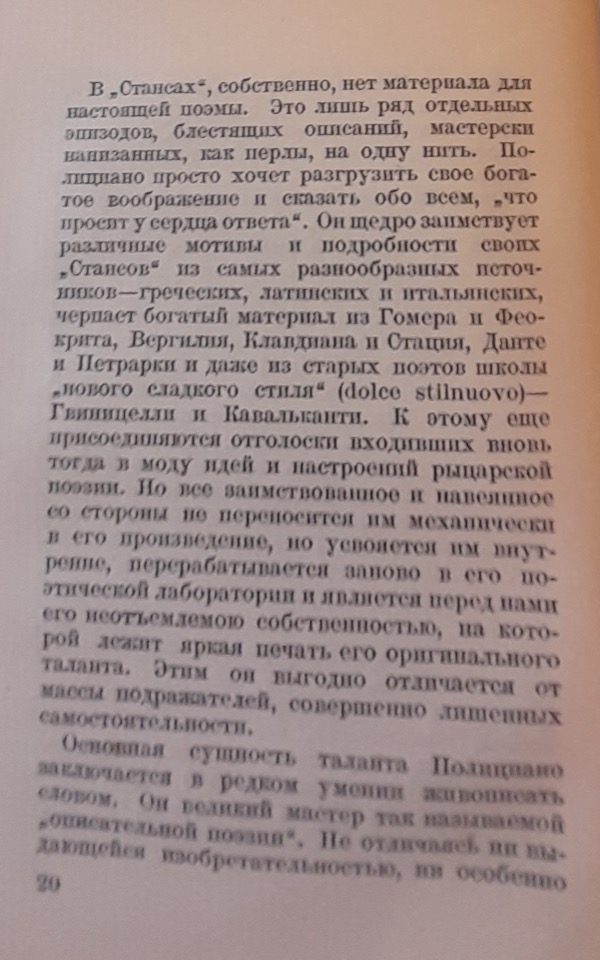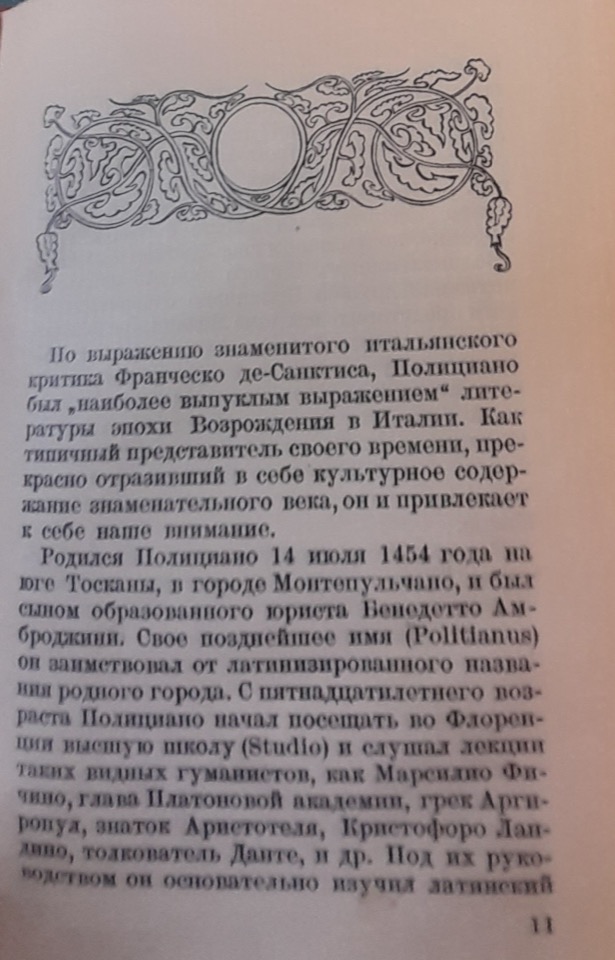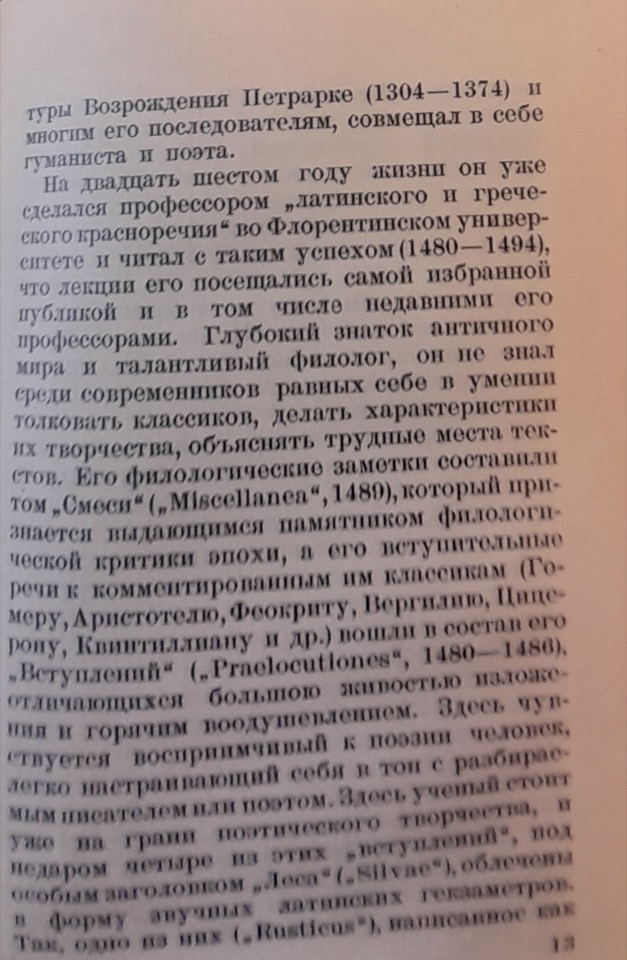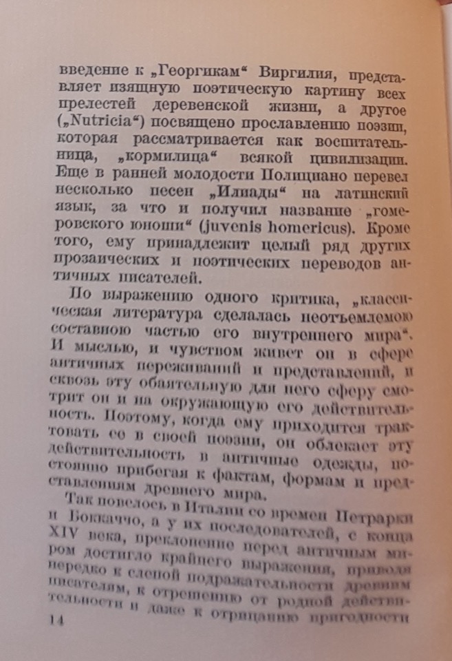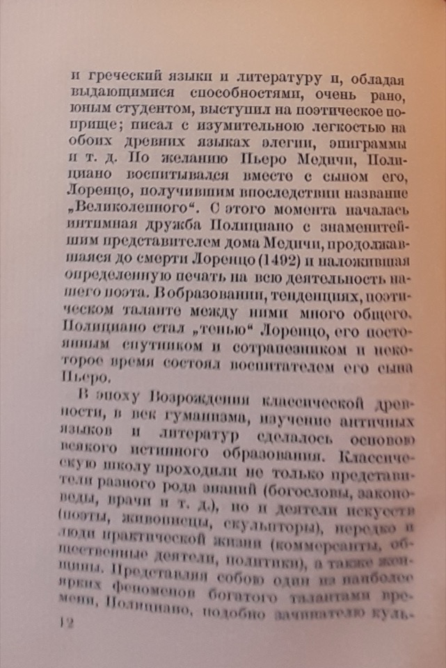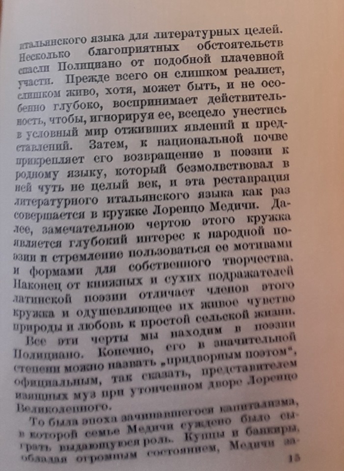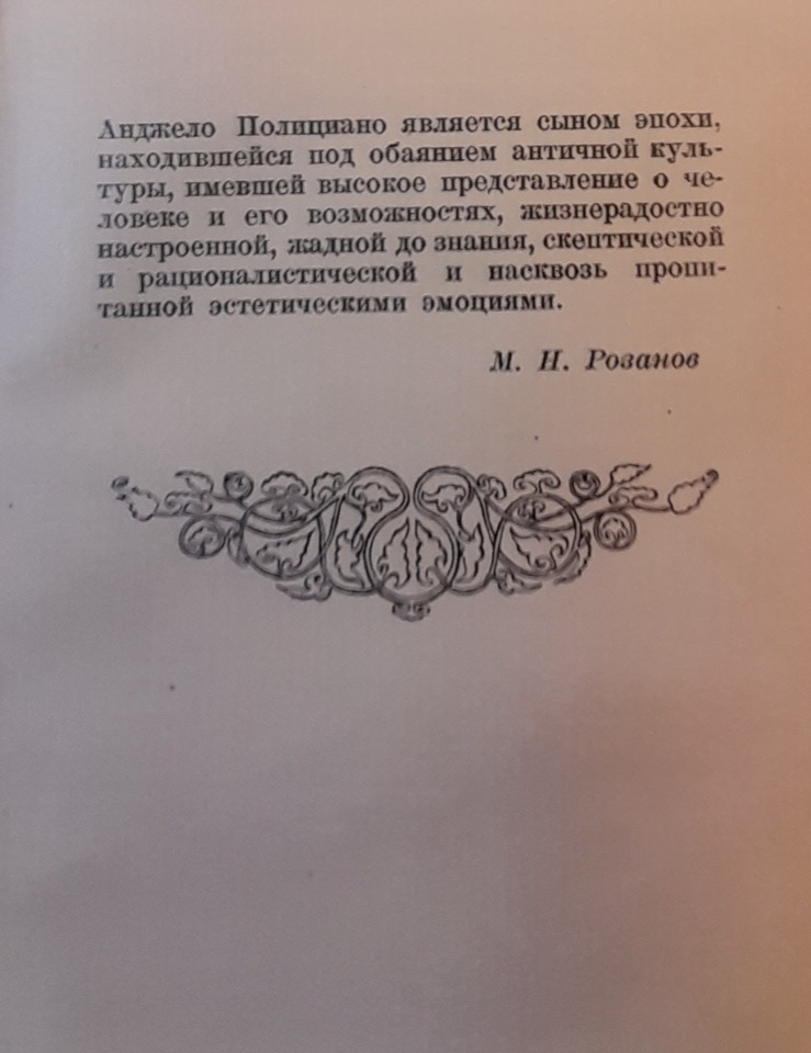 Rozanov usa la terminologia e i concetti di Georg Voigt, citando implicitamente anche l’opera di quest’ultimo, Die Wiederbelebung des classischen Alterthums oder das erste Jahrhundert des Humanismus, per evidenziare la netta distinzione tra Poliziano e altri umanisti che avrebbero imitato “ciecamente” gli autori classici, rinunciando agli argomenti attuali e alla propria lingua nelle loro opere letterarie. Secondo il critico, Poliziano è fortunatamente “troppo realista” e percepisce l’attualità in maniera troppo intensa; inoltre, il suo forte legame con il contesto nazionale è reso possibile dal “restauro” della lingua italiana avvenuto nel circolo di Lorenzo de’ Medici, al quale egli appartiene. Infine, il circolo mediceo nutre un profondo interesse per la poesia popolare e per la semplice vita rurale. Ci troviamo nell’epoca del capitalismo nascente, in cui la famiglia de’ Medici svolge un ruolo fondamentale; Poliziano ne è effettivamente il poeta di corte.