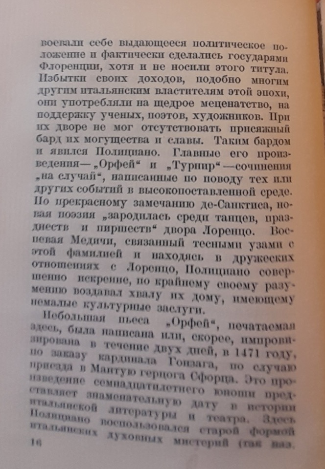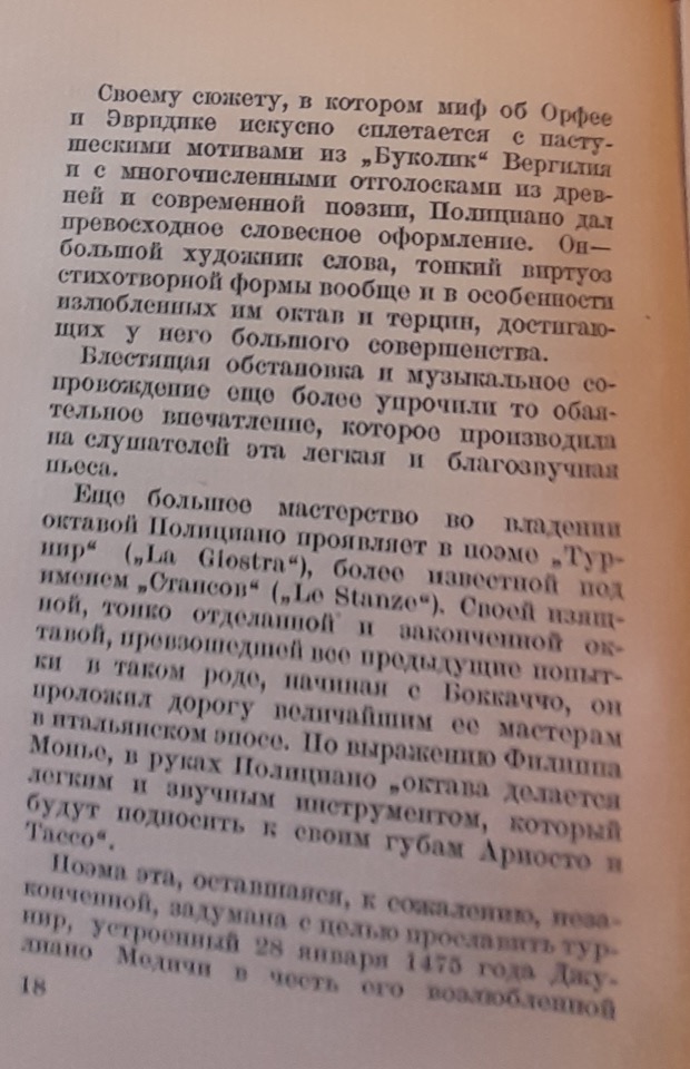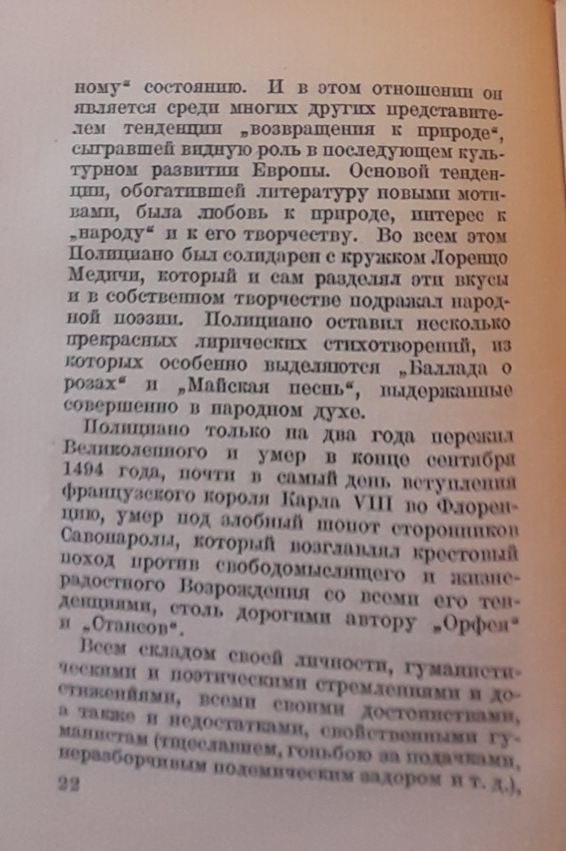 Da notare è che Rozanov, a differenza di Dživelegov, giudichi severamente Girolamo Savonarola, che “sarebbe stato a capo della crociata contro il Rinascimento libertino e gioioso, con tutte le sue tendenze affini all’autore dell’Orfeo“; lo studioso contrappone a questa figura macabra sia Lorenzo il Magnifico sia lo stesso Poliziano, con le loro aspirazioni umanistiche e poetiche.