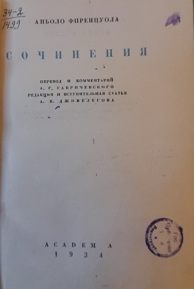 Titolo dell'opera originale tradotta in russo: Opere [Ragionamenti d'amore; Discorsi delle bellezze delle donne]