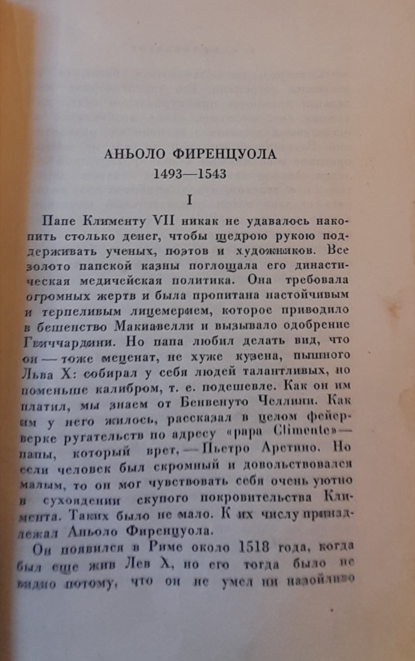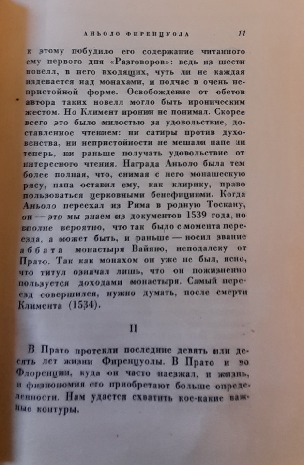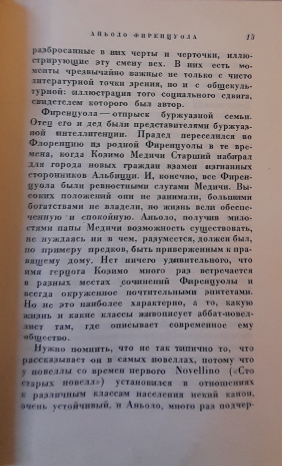 D. si sofferma sulla mancanza di interesse di Firenzuola per la vita sociale e politica, tratto che attirò il papa, il quale lo ricompensò liberandolo dai voti monastici (se Clemente avesse avuto senso dell’umorismo, nota D., lo avrebbe fatto anche solo per aver letto le sue novelle, che in gran parte deridono i monaci). F. viene descritto come rappresentante dell’intellighenzia borghese e devoto servitore dei Medici.
