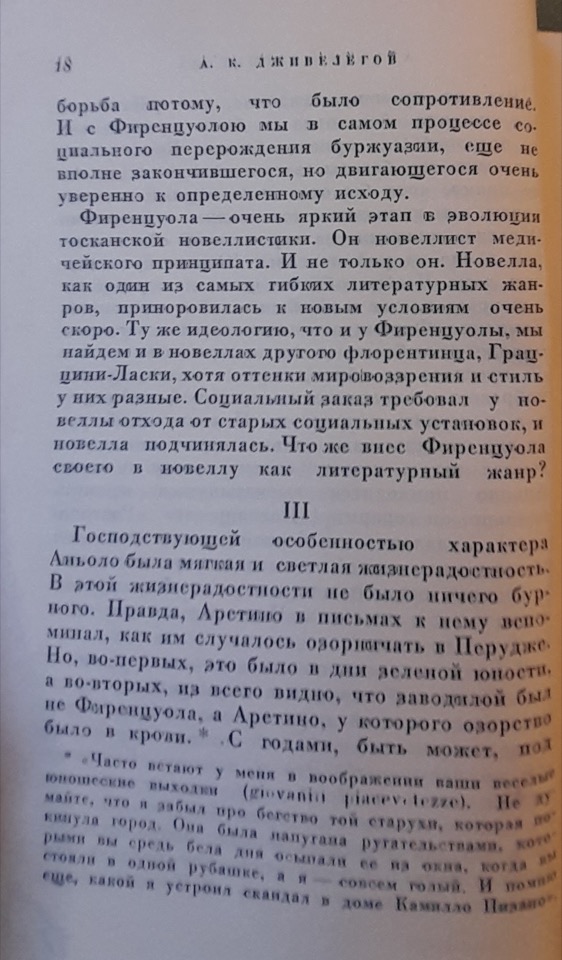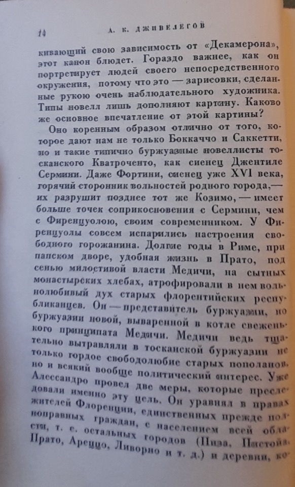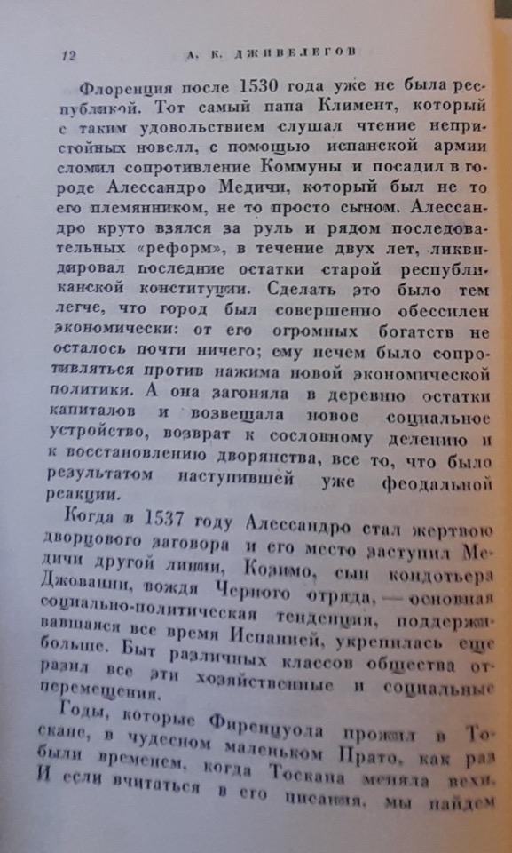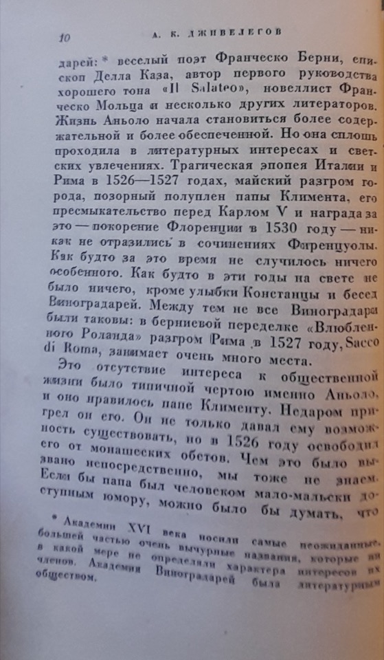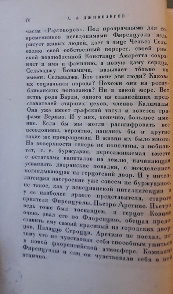 Dživelegov Aleksej Karpovič (1975, Nachičevan'-na-Donu -1952, Mosca) - esperto di storia e letteratura del Rinascimento e del teatro italiano, autore della prima monografia sovietica su Dante, che negli anni Trenta e Quaranta viene considerato lo studioso più autorevole nell'ambito dell'italianistica in URSS e fino al 1937 dirige la collana di letteratura italiana presso Academia. Prima della rivoluzione d'Ottobre fu membro del partito democratico-costituzionale; anche nella Russia zarista applicò l'approccio storico e sociologico allo studio delle opere letterarie. Nel periodo staliniano applica il metodo marxista, anche se non la sua analisi non si riduce mai a quella del metodo "sociologico volgare". Il talento di Dživelegov di comporre ""le prefazioni sociologiche"" venne riconosciuto, in particolare, dal traduttore Michail Lozinskij che chiese allo studioso di corredare la sua traduzione della Vita di Cellini da una prefazione dettagliata.