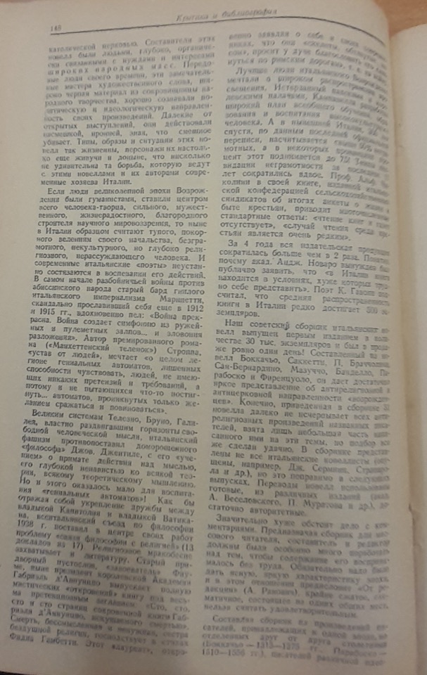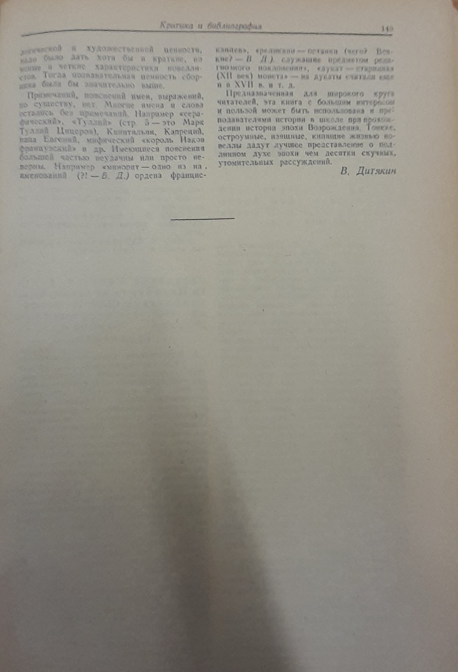 Il critico afferma che la pubblicazione di questo piccolo libro sia estremamente significativa, poiché grazie ad essa milioni di cittadini sovietici potranno finalmente conoscere gli esempi più incisivi di quell’arma di cui le masse popolari si servirono per combattere i propri nemici feudali e il centro internazionale del sistema feudale: la chiesa cattolica. Gli autori delle novelle erano visceralmente legati agli interessi delle masse popolari.
