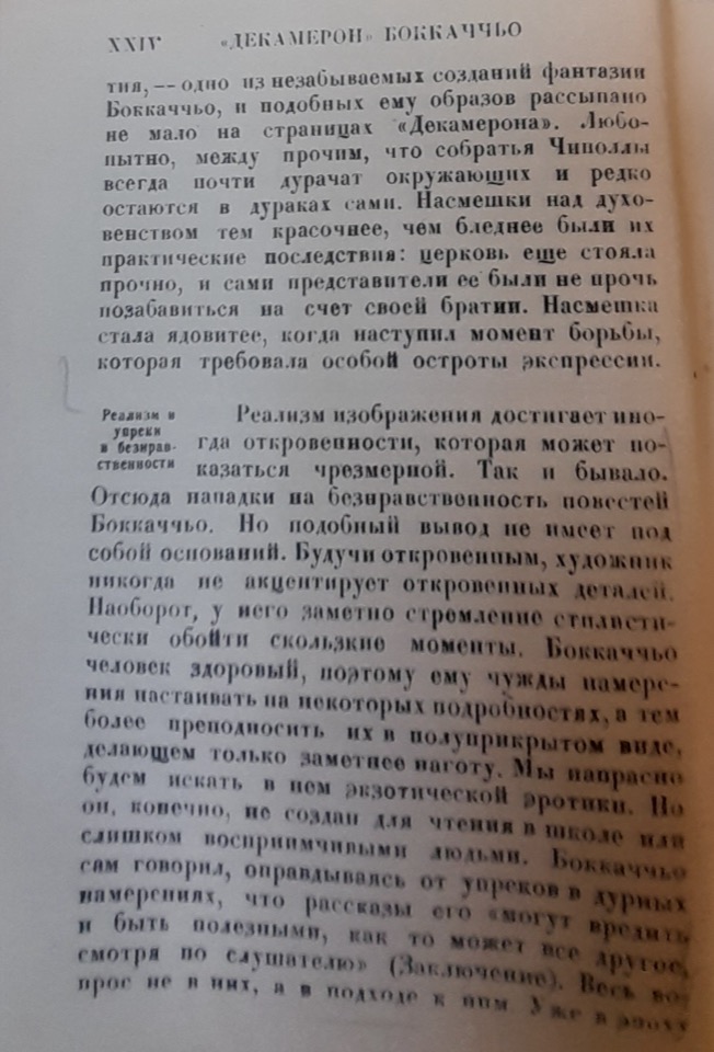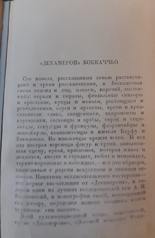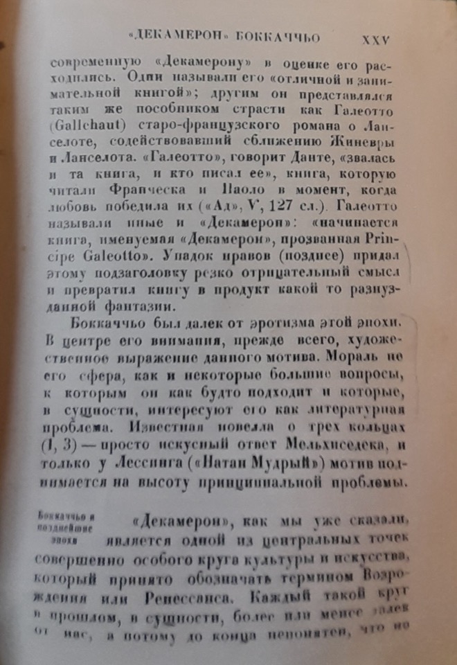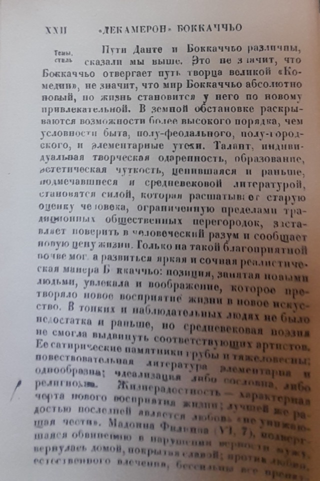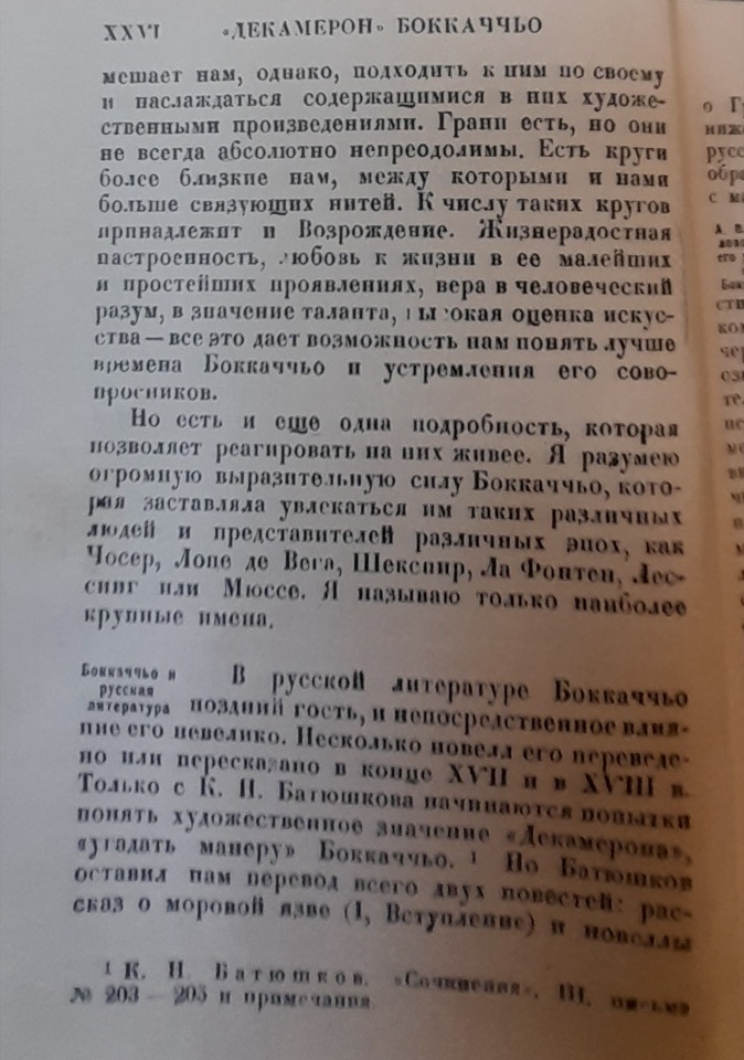 Esistono periodi storici più distanti e altri più prossimi al lettore sovietico, tra i quali spicca il Rinascimento, di cui l’opera di B. rappresenta uno degli apici. I tratti comuni sono riconducibili a: gioia di vivere, amore per la vita nelle sue manifestazioni più semplici, fiducia nell’intelligenza e nel talento umano, nonché un’alta considerazione dell’arte.
