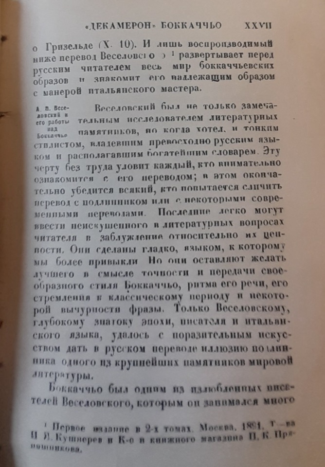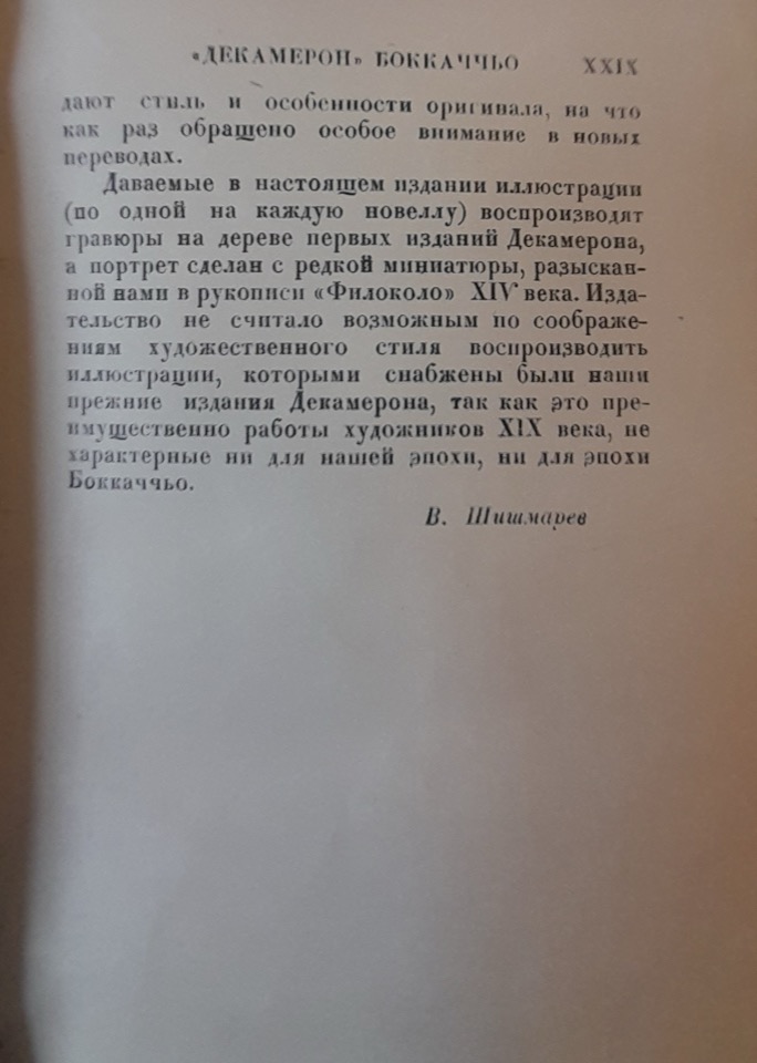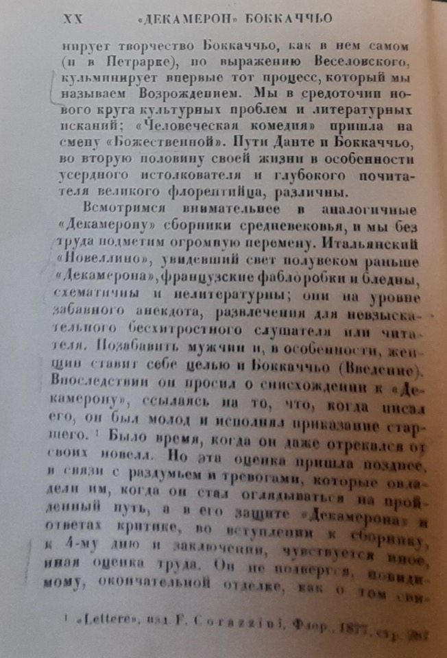 Šišmarev definisce B. come il creatore di quella grandiosa “Commedia umana” che si intitola “Decameron”, ribadendo come, nell’opera dell’autore, la rappresentazione della commedia umana sia andata a sostituire quella della Divina Commedia; le traiettorie di Dante e di B., infatti, sono profondamente diverse, sebbene ciò non implichi che B. rinneghi il suo predecessore.