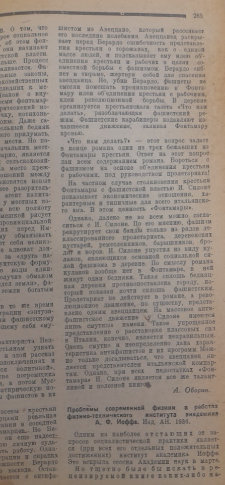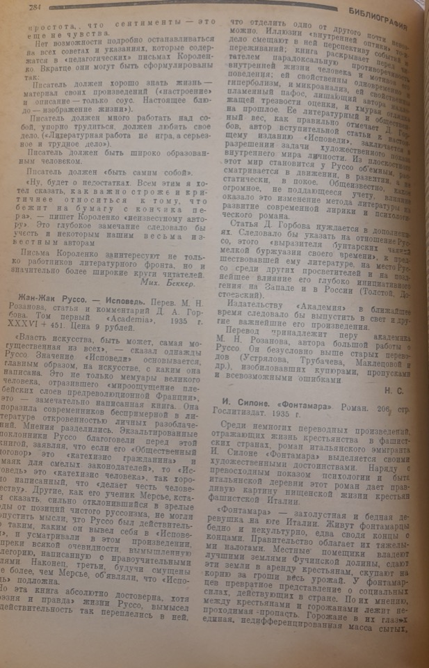 Il critico afferma che, tra le poche opere tradotte che descrivono la vita dei contadini nei paesi fascisti, il romanzo di Silone si distingue per i suoi pregi letterari e per il realismo con cui rappresenta la miseria delle campagne italiane sotto il regime fascista. Il messaggio dell’opera è altresì corretto: per migliorare la propria condizione, i contadini devono unirsi agli operai nella lotta antifascista sotto la guida del proletariato. – cfr. le direttive e gli articoli: D219, 220 (da notare che Rossi non cita Silone tra gli scrittori italiani menzionati nel suo articolo)