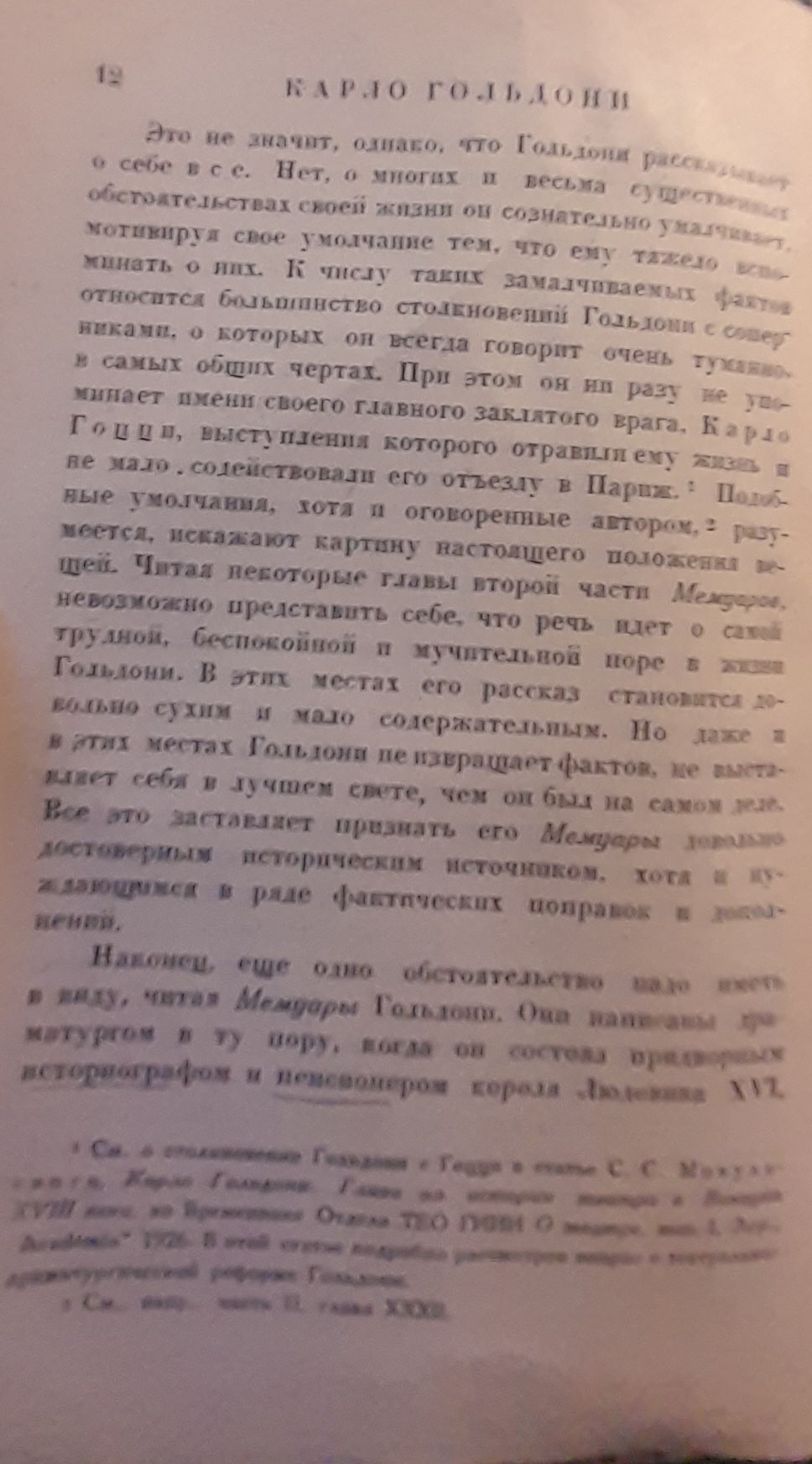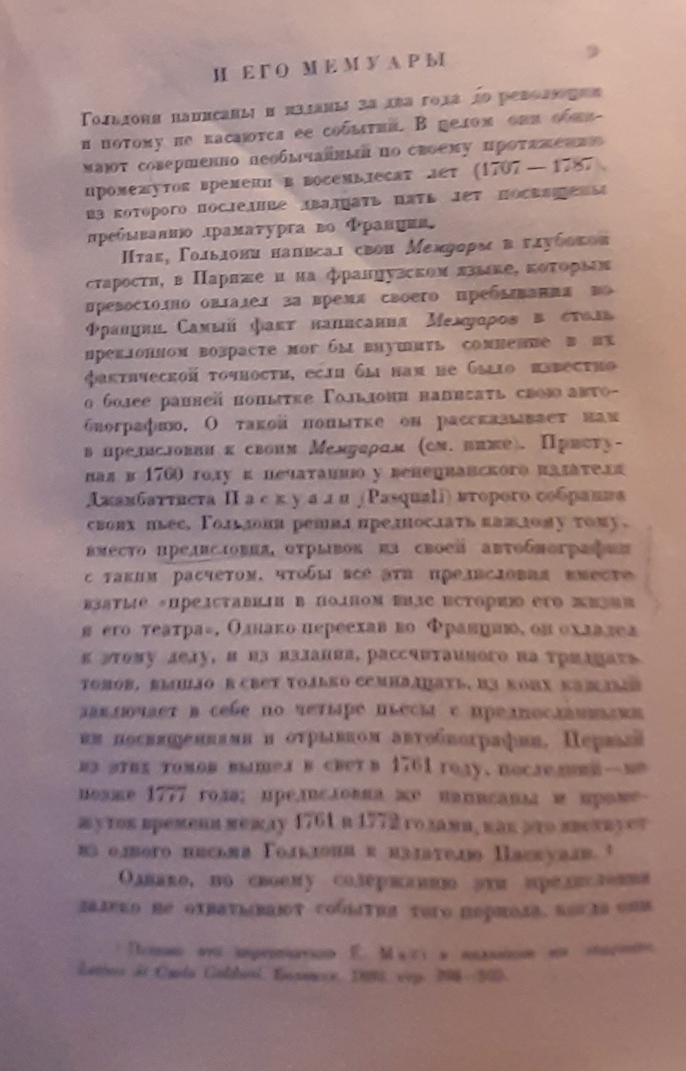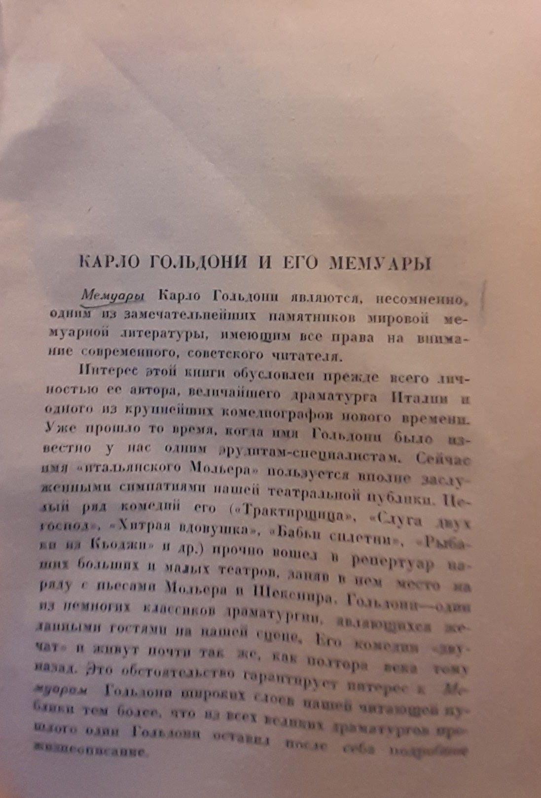 Collocazione paratesto: Memuary Karlo Goldoni, soderžaščie istoriju ego žizni i ego teatra, t. 1 – Leningrad – Akademia – pp. 5–15