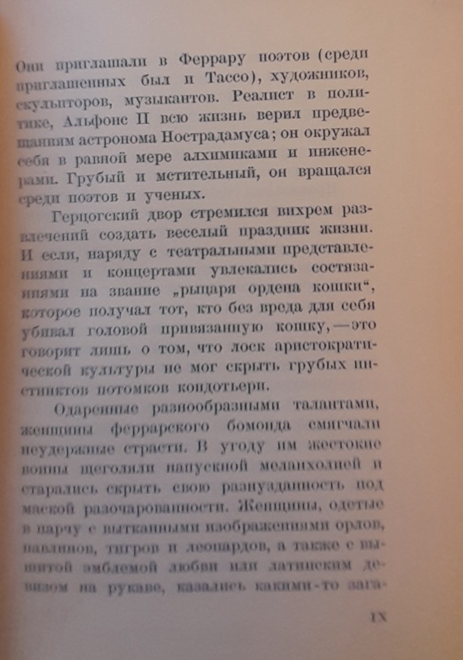 Èjchengol’c ripete la tesi di Burckhardt affermando che il Rinascimento italiano è l’epoca dell’individualismo; l’Italia rinascimentale è costituita da piccoli Stati, alcuni governati da famiglie nobili. Sebbene la famiglia degli Este si distinguesse nella storia della nobiltà italiana per una particolare crudeltà e dissolutezza, fu tuttavia considerata un importante mecenate per poeti, pittori, scultori e musicisti. L’eleganza della cultura aristocratica, tuttavia, non riusciva a mascherare gli istinti rozzi dei discendenti dei condottieri. Solo le donne, vestite con abiti ricoperti di ornamenti allegorici, riuscivano ad ammorbidire le passioni di una corte che ancora aspirava agli ideali cavallereschi della Tavola Rotonda.
