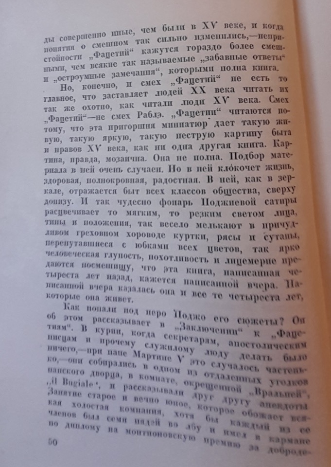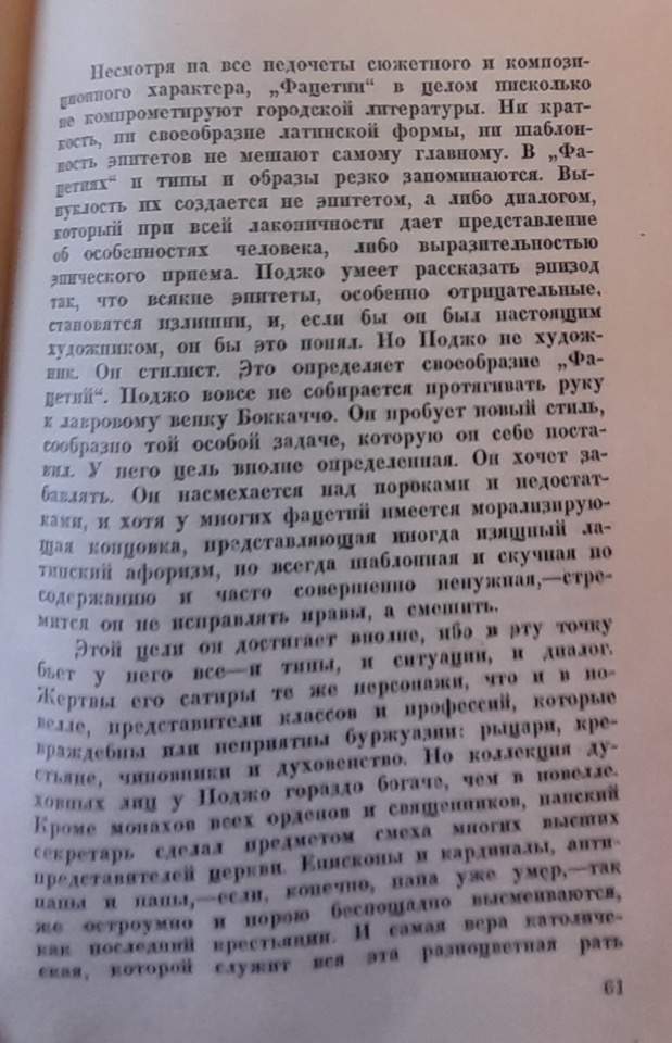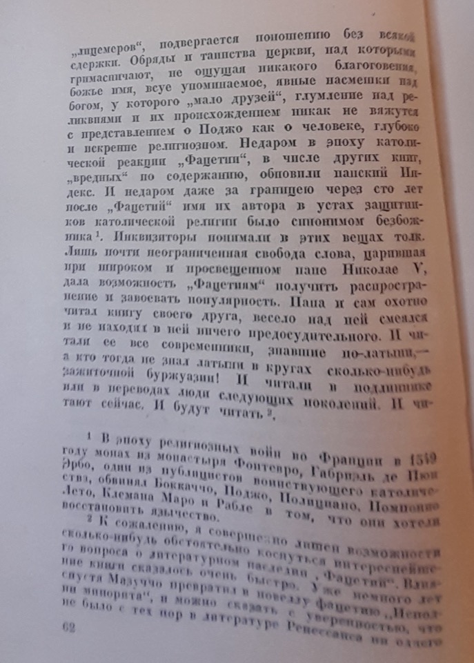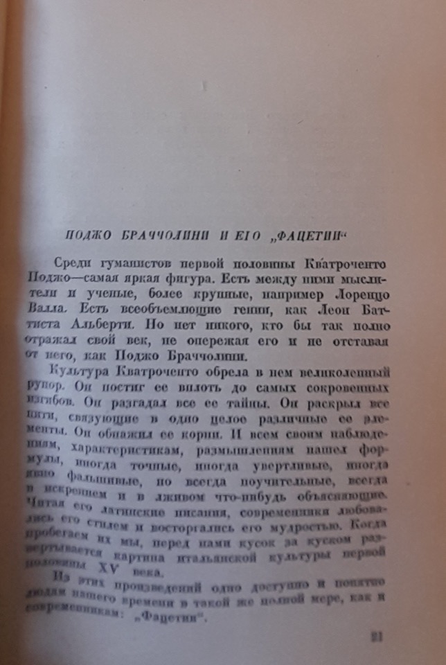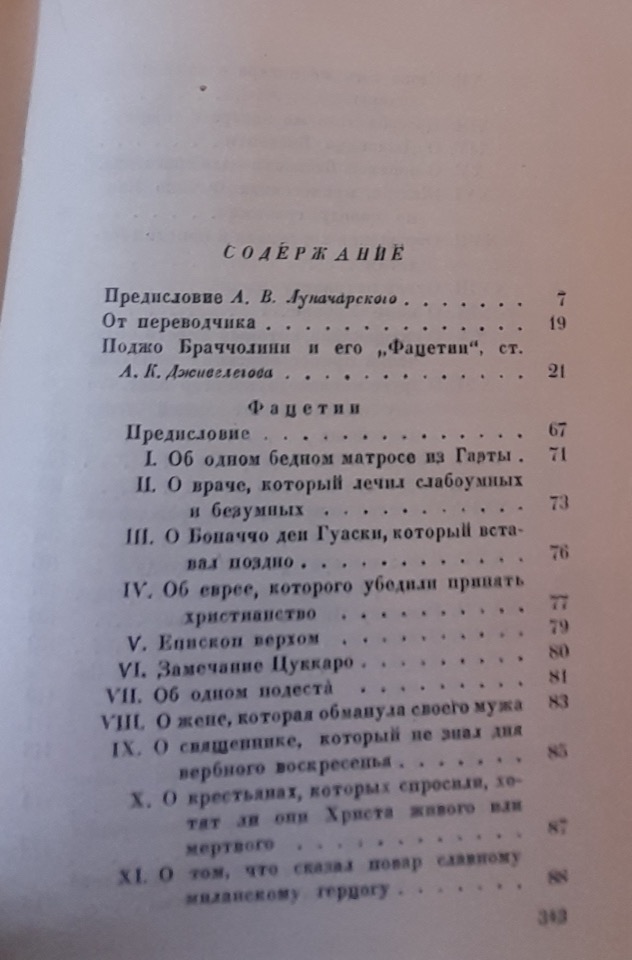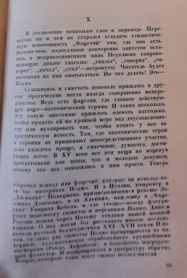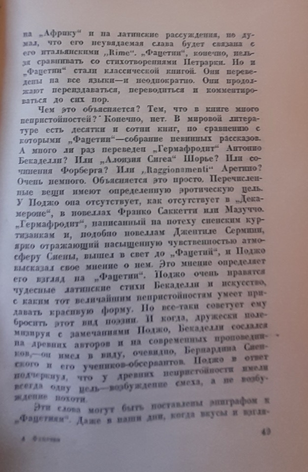 L’introduzione di Dživelegov è preceduta da una nota del traduttore in cui viene specificato che, prima della rivoluzione d’Ottobre, la censura zarista proibiva la pubblicazione delle Facetiae con la scusa dell’indecenza dei suoi “racconti”; tuttavia, secondo Dživelegov, la vera causa del divieto non fu solo la consueta tendenza antiecclesiastica tipica di molti umanisti e novellisti, ma anche quella antireligiosa. Egli nota inoltre che le “miniature blasfeme” di B. venivano “lanciate” dall’autore direttamente dalla Santa Sede, ossia dal centro della religiosità occidentale; tali miniature diventano ora per la prima volta accessibili al pubblico sovietico e sono senz’altro destinate a entrare a far parte della corrente ideologica dell’attualità sovietica.