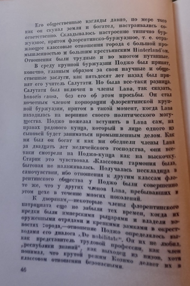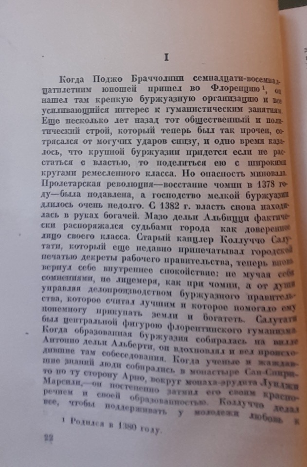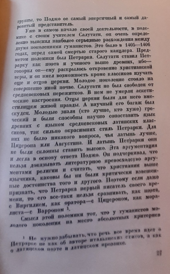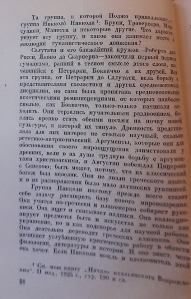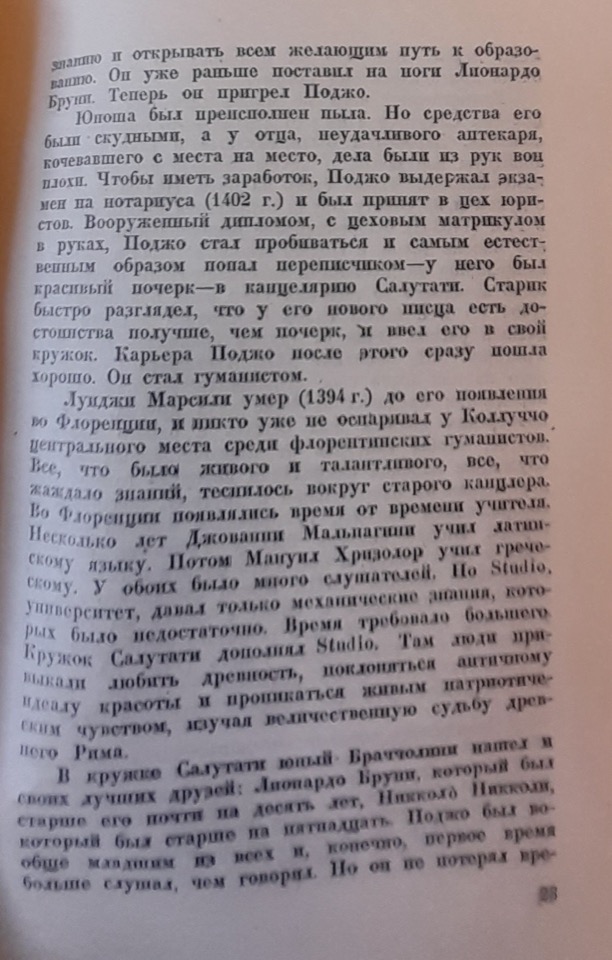 Nell’introduzione storica, Dživelegov definisce B. come la figura più caratteristica tra gli umanisti del primo Quattrocento italiano, poiché egli avrebbe compreso a fondo i misteri della sua epoca e le sue stesse radici. Il “gruppo” a cui appartenne B. nella Firenze borghese fu quello di Bruni, Manetti e alcuni altri. Il “gruppo” di Salutati concluse la prima fase dell’umanesimo, iniziata con Petrarca e Boccaccio; in quella fase gli umanisti contrastavano i rappresentanti del pensiero scolastico ma rimanevano ancora influenzati dalla filosofia ascetica medievale, dalla quale solo i più temerari, come Boccaccio, cominciavano a prendere le distanze. La prima fase era caratterizzata da un tormentato sdoppiamento interiore degli umanisti; l’antichità classica attraeva i letterati dell’epoca più sul piano estetico e patriottico che scientifico; non conoscevano la lingua greca e disponevano ancora di pochi manoscritti.
