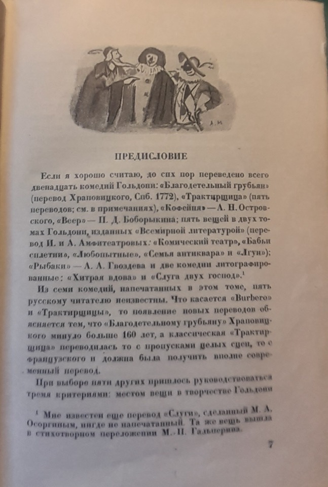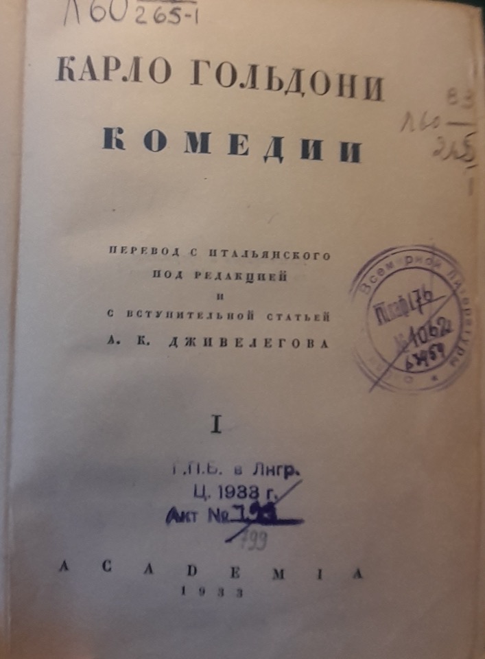 Titolo dell'opera originale tradotta in russo: Commedie [L'avventuriere onorato; Il feudatario; La locandiera; Un curioso accidente; I rusteghi; Le smanie per la villeggiatura; Le bourru bienfaisant]