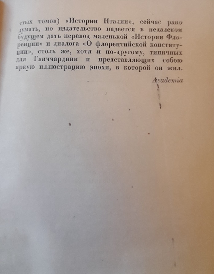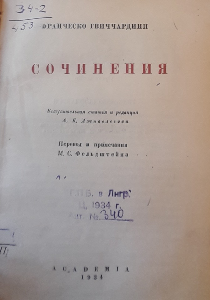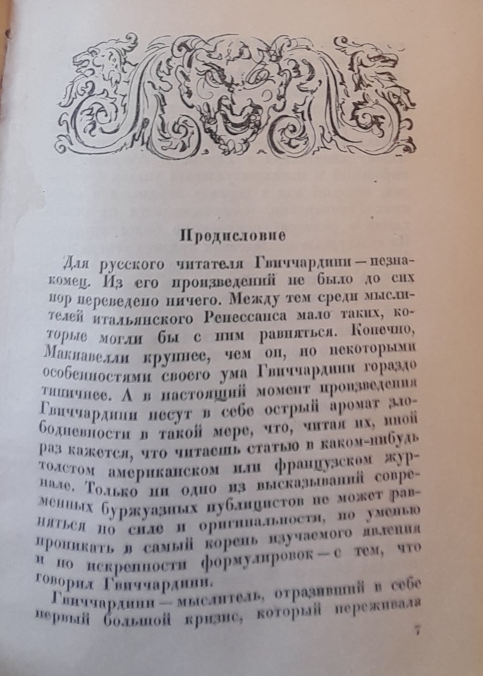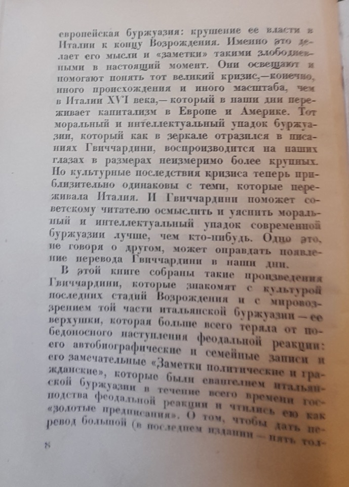 Per il lettore russo, Guicciardini è una figura del tutto sconosciuta. Tuttavia, si tratta di un autore di straordinaria attualità; la sua prosa, infatti, richiama alla mente quella degli articoli delle riviste americane o francesi contemporanee, sebbene gli autori borghesi odierni non possano eguagliarlo né per forza espressiva, né per originalità, e tantomeno per la capacità di analizzare in profondità le cause dei fenomeni storici. La sua scrittura, nel riflettere la profonda crisi vissuta dalla borghesia italiana alla fine del Rinascimento, ci aiuta a comprendere la crisi – seppure diversa per alcuni aspetti – che attraversa oggi il capitalismo americano ed europeo, con il suo degrado morale e intellettuale.