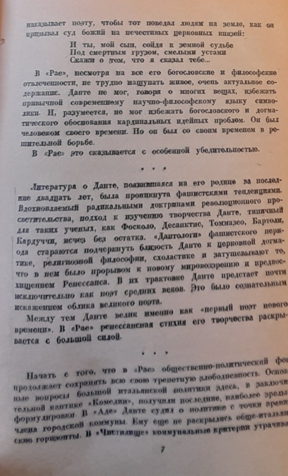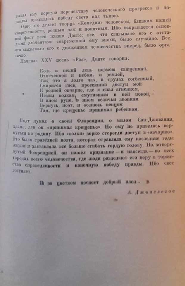 Scopo della prefazione è sottolineare il “contenuto vivo, molto attuale” della terza cantica e di mostrare come, pur essendo figlio della propria epoca, con i suoi inevitabili “limiti” dottrinali, l’Alighieri abbia lottato contro i dogmi della chiesa con particolare fervore proprio nel Paradiso. Uno spazio importante nell’articolo di Dživelegov viene dedicato, inoltre, alla critica dantesca italiana a lui contemporanea che secondo lo studioso sarebbe intrisa di tendenze fasciste. Nel contrapporre a questi nuovi studi le ricerche di Ugo Foscolo, Francesco De Sanctis, Niccolò Tommaseo e Giosuè Carducci, ispirate alle dottrine dell'”illuminismo rivoluzionario”, Dživelegov rimprovera agli ultimi il tentativo di accostare Dante alla filosofia scolastica e di rappresentarlo come poeta del Medioevo ignorando gli elementi rinascimentali della sua opera che costituirebbero la sua grandezza e risulterebbero ben presenti anche nel Paradiso. La percezione del tutto negativa del Medioevo cattolico e l’opposizione a quest’epoca del Rinascimento inteso come periodo della liberazione del genio umano dal dominio dell’oscurantismo teocratico e feudale erano tipiche degli studi storici del periodo staliniano, a partire dalle enciclopedie fino ai manuali e articoli scientifici di cui alcuni polemizzavano aspramente con ricerche occidentali sull’umanesimo.