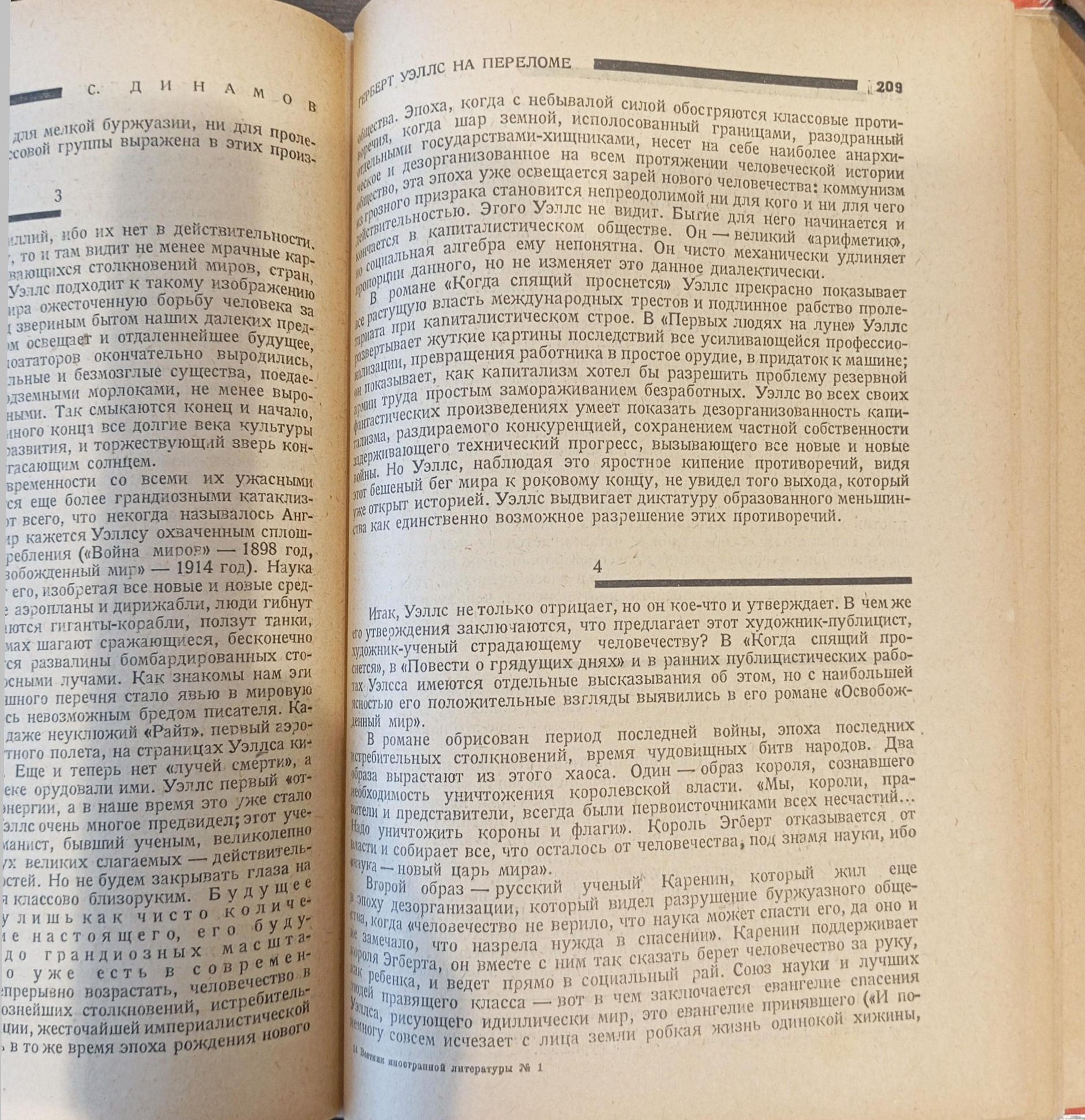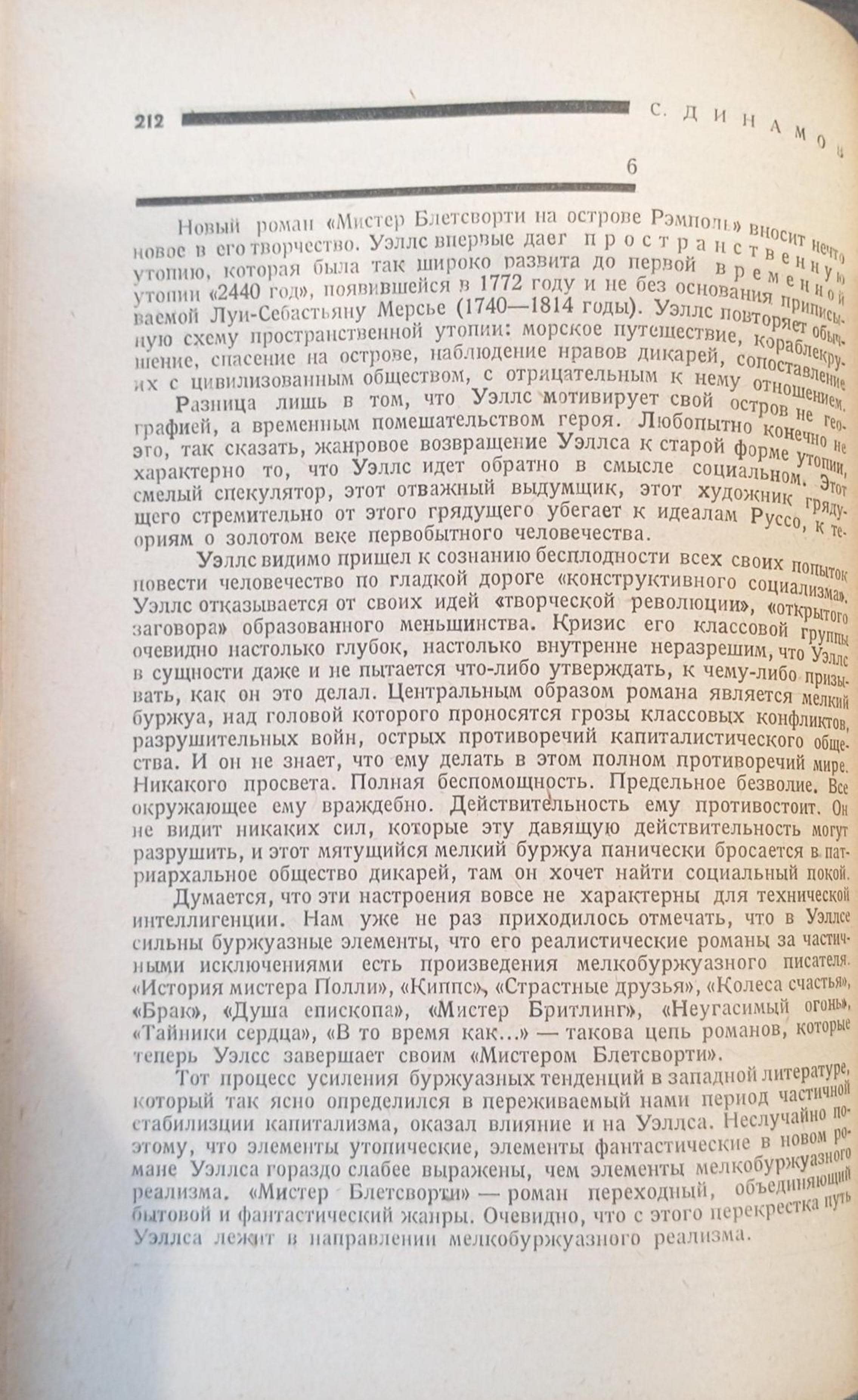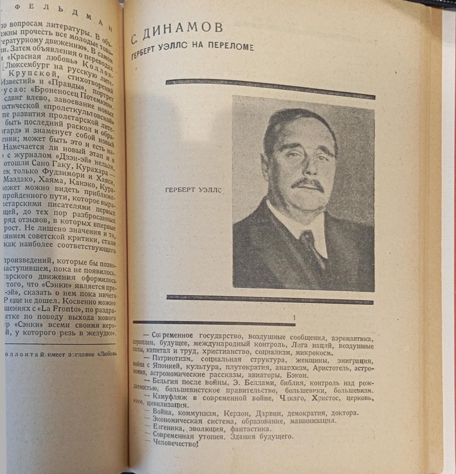 Dinamov notes the extraordinary prolificacy of H.G. Wells, whose literary output spans 94 works, and his unique position in the English literary landscape. The comparison with Bernard Shaw underlines the originality with respect to the Irish writer, placing him in a position of his own. Indeed, Wells is considered one of the three greatest English writers of his time, together with James Joyce and John Galsworthy (novelist and playwright, future Nobel Prize winner for literature in 1932), as well as the one and only undisputed world master of the science fiction genre. Among Wells’ most significant ideological contributions are his lucid critique of bourgeois society, seen as an obstacle to scientific and technological progress, and his analysis of the subaltern condition of the proletariat. At the same time, Dinamov points to a certain class ‘myopia’ in Wells: the writer does not seem to grasp the emergence of communism, remaining rather anchored in a strictly capitalist perspective. The weakness of the writer’s ideology, the critic continues, lies in the proposal of an enlightened dictatorship, entrusted to an educated minority, as the only solution to social contradictions. This perspective denotes Wells’ lack of understanding of revolutionary processes and class struggle (on the ‘errors’ of Wells and other contemporary writers from his country, see D084). In conclusion, the Wellsian ideology presents itself to Dinamov’s eyes as a complex web of contradictions. On the one hand, the writer stands in clear opposition to capitalism, on the other, he seems to lean towards a kind of alliance with it, while rejecting the theory of class struggle.