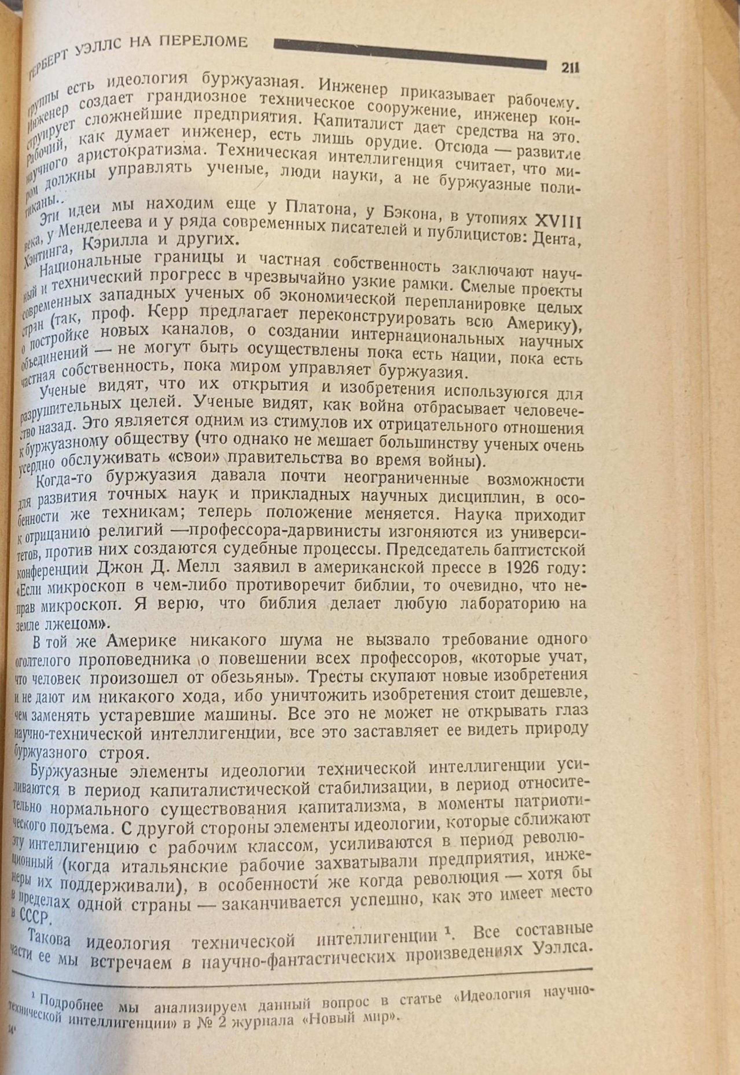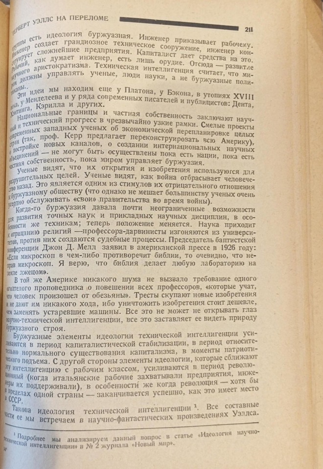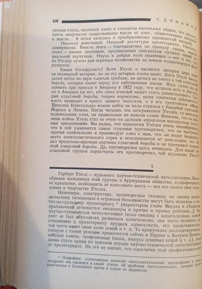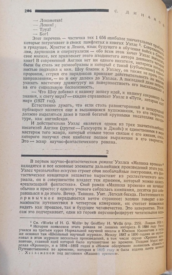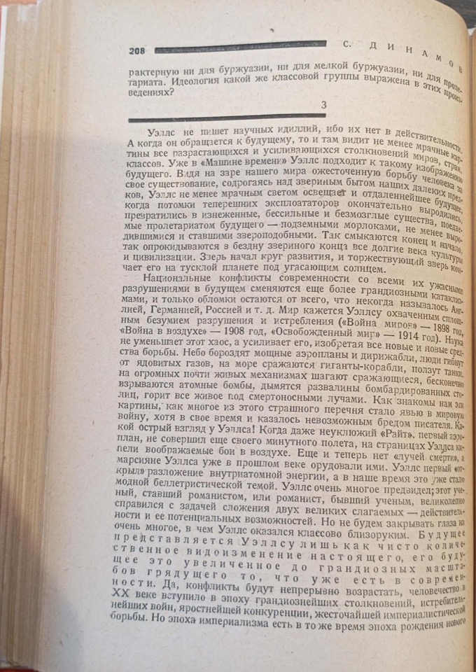 Dinamov notes the extraordinary prolificacy of H.G. Wells, whose literary output spans 94 works, and his unique position in the English literary landscape. The comparison with Bernard Shaw underlines the originality with respect to the Irish writer, placing him in a position of his own. Indeed, Wells is considered one of the three greatest English writers of his time, together with James Joyce and John Galsworthy (novelist and playwright, future Nobel Prize winner for literature in 1932), as well as the one and only undisputed world master of the science fiction genre. Among Wells’ most significant ideological contributions are his lucid critique of bourgeois society, seen as an obstacle to scientific and technological progress, and his analysis of the subaltern condition of the proletariat. At the same time, Dinamov points to a certain class ‘myopia’ in Wells: the writer does not seem to grasp the emergence of communism, remaining rather anchored in a strictly capitalist perspective. The weakness of the writer’s ideology, the critic continues, lies in the proposal of an enlightened dictatorship, entrusted to an educated minority, as the only solution to social contradictions. This perspective denotes Wells’ lack of understanding of revolutionary processes and class struggle (on the ‘errors’ of Wells and other contemporary writers from his country, see D084). In conclusion, the Wellsian ideology presents itself to Dinamov’s eyes as a complex web of contradictions. On the one hand, the writer stands in clear opposition to capitalism, on the other, he seems to lean towards a kind of alliance with it, while rejecting the theory of class struggle.