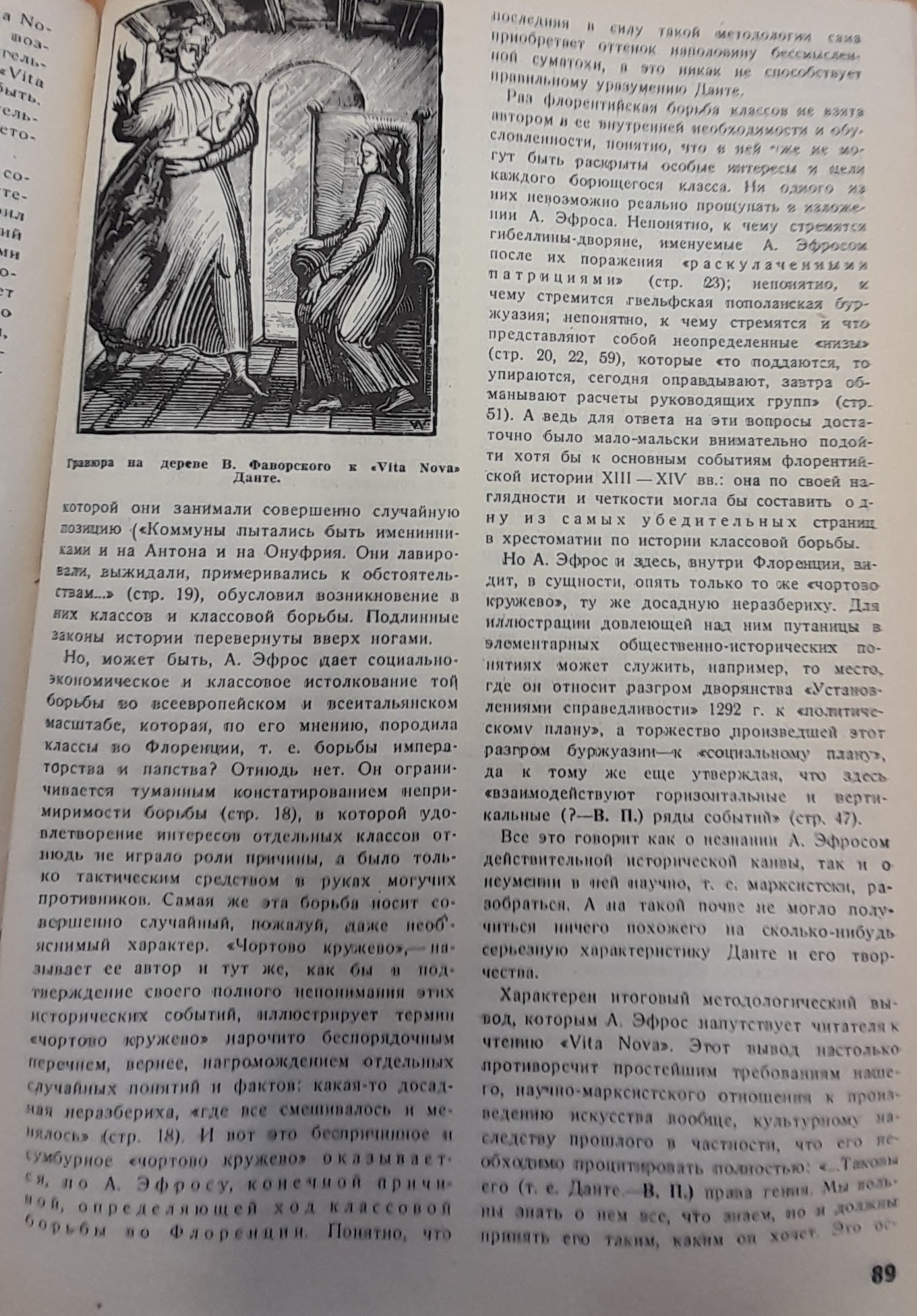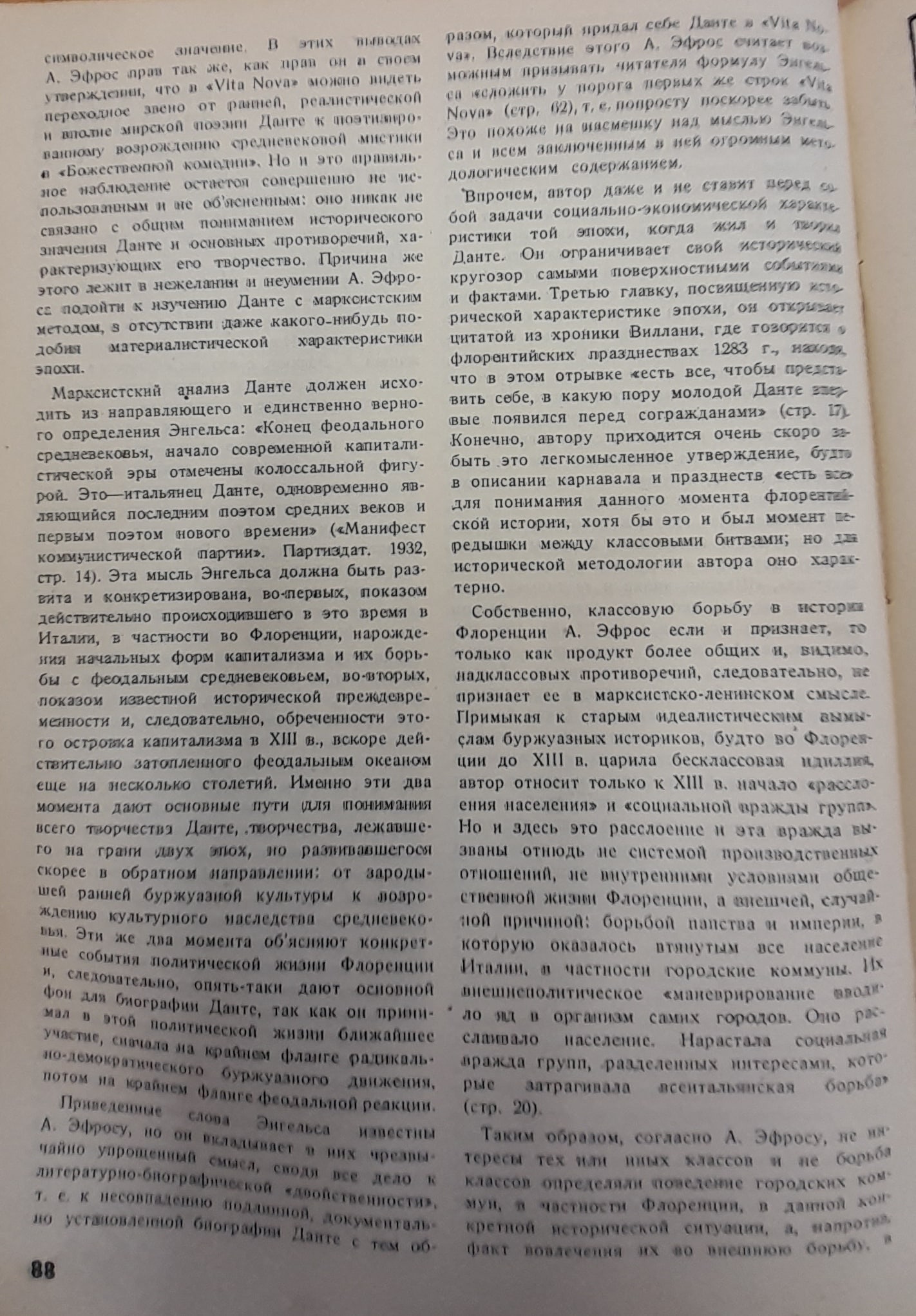 The work of Efros is not Marxist in terms of method and content (D009). It characterises the political situation in Florence too superficially; it does not recognise the class struggle underlying the social processes in Italian history; it considers Dante’s inner split only as a divergence between Dante’s character and the historical Dante. Efros imposes on his readers all the dead concepts of Dante’s poetry, including medieval mysticism.