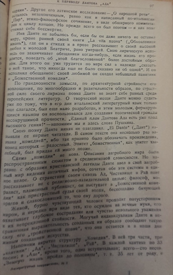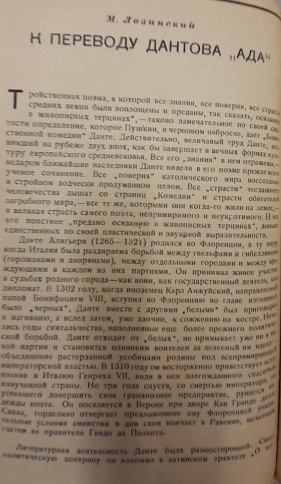 Author's bio: Mikhail Leonidovich Lozinsky (1886-1955) - Acmeist poet also close to Symbolist circles of the early 20th century, translator and lecturer in poetic translation, employee of the Leningrad National Library, collaborator of the Vsemirnaya Literatura publishing house, friend of many important literati and critics of the time, including Anna Akhmatova, Korney Chukovskiy and Nikolay Antsiferov. Lozinsky translated many European classics from French, Spanish, English and Italian partly following the formalist method proposed by Gumilev in poetic translation, i.e. paying particular attention to the correspondence between the formal structures of the source text and the target text. His best-known masterpiece in this field was the translation of Dante's Commedia, a work he undertook in 1936 and completed in 1942, meanwhile publishing translations of individual cantos in various literary journals. Even in later years, however, he never stopped revising and supplementing his scholarly commentary on Dante's poem, mainly due to the demands of publishers determined by the country's atheistic censorship. The translation, initially commissioned by the Academia publishing house, was published in three volumes by GIHL (Goslitizdat) following the closure of Academia during the 1937 repressions and the transfer of its unfinished projects to the GIHL administration. Inferno came out in 1939 accompanied by Ivan Grevs' commentary and Aleksey Dzhivelegov's preface and was later reprinted in 1940 with Aleksandr Beletskiy's commentary; Purgatorio came out in 1944 and Paradiso in 1945, the year of the end of World War II, and both canticles were punctually accompanied by Dzivelegov's preface. Then, in 1950, Goslitizdat published the full translation in one volume with Konstantin Derzhavin's preface. In 1952, Lozinsky was invited to revise his commentary for a new publication planned by the Academia Nauk publishing house, which never took place. Today, the canonical version is considered to be the 1967 posthumous edition published by the Nauka publishing house with a preface by Ilya Nikolaevich Golenishchev-Kutuzov. Bibliography: K. Landa, Bozhestvennaya Komediya v zerkalakh russkikh perevodov, Sankt-Peterburg, RHGA, 2020, pp. 321-427; K. Landa, Kanonizirovannyi i neprinjatyi Dante. K istorii recepcii i cenzury Bozhestvennoy Komedii v SSSR, "Studi Slavistici", 18 (2021), pp. 147-173; K. Landa, Le traduzioni russe della Commedia: Il Novecento e Michail Lozinskij, in Dante oltre i confini: La ricezione dell'opera dantesca nelle letteratura altre, a cura di S. Monti, Alessandria, Edizioni Dell'Orso, 2018, pp. 123-138, and the bibliography.