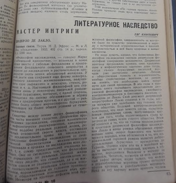 In a slightly ironic vein, Evgeniya Fedorovna Knipovich (1898 – 1988), a former aspiring poet in the Symbolist sphere, the last companion of Aleksandr Blok, and a literary woman who from the second half of the 1920s undertook a personal ideological ‘reformation’, embracing the new political and cultural course of Soviet Russia (she worked as a literary critic and editor), reviews Choderlos de Laclos’ book, published in 1933. Knipovich chooses a title for her review that is intended to do justice to the French writer’s literary qualities: Master intrigi [A master of intrigue]; after which, she resorts to the well-established technique of ideological validation of her own words, by quoting, in an almost incipital position, from a Marx and Engels passage on the philosophy of pleasure: “The philosophy of pleasure, according to Marx, emerged in the new times with the disappearance of feudalism and the transformation of the feudal rural nobility into a pleasure-seeking and dissolute courtly class typical of absolutism” . However, the quotation appears even more relevant if we examine the literary and critical context in which it is quoted. The excerpt quoted by Knipovich, in fact, comes from the German Ideology, a collection of works by Marx and Engels that had been studied and published for the first time ever in Moscow, and had been in print for less than a year, first in the German original (1932), then in Russian (1933). The publication of this fundamental work was edited by scholars from the renowned research centre Institut Marksa – Engel’sa – Lenina in Moscow. Having framed the “libertine novel par excellence” (L. Versini) within the Marxist-Leninist conception, Knipovich continues her assessment by talking about a book that ‘unmasks’ the vices of aristocratic society, in which the only positive character (albeit, according to her, faint-hearted and boring) is the bourgeois President de Tourvel. Knipovich here uses classic formulas, already inflated in the early 1930s, and traceable to the usual ideological and historical-literary orthodoxy: for him, a book, if ideologically controversial, as the libertine Opasnye svyazi naturally was, had to be at least unfailingly “razoblachitel’niy” (the adjective is used three times in the short text); in the words of the critics: “A great master of disguise and intrigue, an Orleanist working as a ‘democrat’, an ageing counterrevolutionary in the service of the revolution, Choderlos de Laclos wanted to disguise his book as a novel of denunciation. And yet, for us, it is a revealing and exposing book. Contrary to the author’s secret intentions, his book has provided us with a great deal of material for criticism. Knipovich thus already anticipates, even in the very use of the term vopreki (despite), the Lukacsian theory of ‘voprekism‘ (the theory by which it appeared possible to publish/disseminate a particular author and artist (even harshly criticising him) with the ultimate aim of openly proposing him to the Soviet public, a theory formally inaugurated in the journal “Literaturniy kritik” by the famous article, focusing particularly on Balzac. Having thus accomplished the usual formal captatio benevolentiae at the beginning of his article, Knipovich then notes the vividness and realism with which the demonic, terrible characters of the Viscount de Valmont and the Marquise de Merteuil are given, emphasising the psychological depth and three-dimensionality of the characters and events and at the same time the militant and political relevance of the book: “The psychological analysis of his novel, unprecedented in the literature of the time, is so profound that the real class nature of these predators and the real social relations that generated them become clear to us. Moreover, it is not difficult for us to guess what the sisters of the Marquise de Merteuil and the brothers of the Vicomte de Valmont, with their diabolical intelligence, shamelessness, energy, cunning, willpower and deception, were for in the countries of the counterrevolution 70 years later (the book was published in 1782). Laclos’ characters are disgusting rather than mocking. They are not small reptiles that are crushed along the road, but large reptiles that can only be annihilated by a bullet.”In particular the last sentence, with its reference to the small, harmless reptiles (irrelevant enemies) in contrast to the big monsters/reptiles, which can only be defeated with bullets (the selfish, demonic aristocrats of the ancien régime) almost seems to be a reference to the giant, counter-revolutionary snakes of Bulgakov’s The Fatal Eggs, published only a few years earlier. Later in the article, the language and style of the French writer in particular are praised, again often with reference to the principle of realism and tipichnost’: “The book is very strong compositionally and stylistically, the characters are unusually individual and complete in their typicality, the language of each letter (Dangerous Liaisons is an epistolary novel) is so particular, so inherent to the person in question and defines him or her so vividly that it would do credit even to a first-class playwright. the alternation of different, individual discourses creates a special, unique, complex and fascinating style.” (p. 46). There is no lack of appreciation for the translation and the introductory article (however, let us remember at the same time that Knipovich was still in those years part of the inner circle of Lev Kamenev, who in ’32-’33 was director of Academia, the publishing house that had published Laclos’s book), passing only a slight snide remark against the “impressionistic style” and spotty style of Abram Efros’s preface, which, even if it reported “curious data and news, truthful considerations” these were “too impressionistic and suffer from the absence of precise definitions and generalisations”.