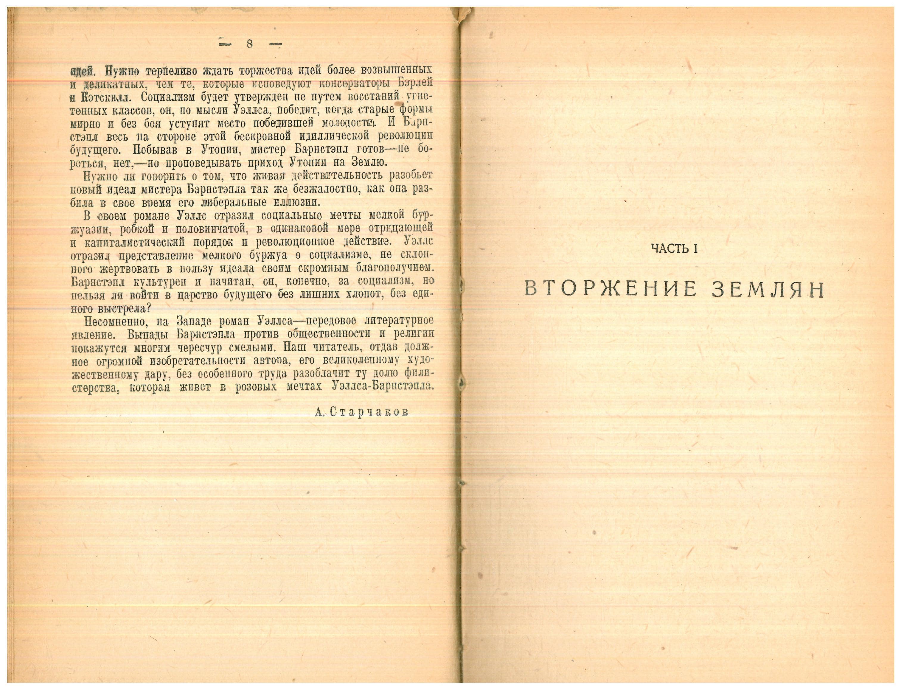 While criticising his idealism and rejection of Marxism, Starchakov is ‘lenient’ towards Wells: he recognises him as a socialist anyway. This, in his opinion, constitutes the greatest merit of Wellsian thought. The reader, he says, will grasp the inconsistency of his ideas, without denying him the merit of a great intelligence and first-class artistic talent.