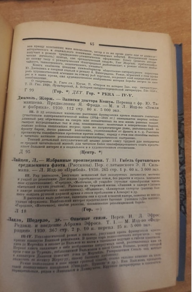 The bibliographical bulletin refers to Laclos’ novel as an “epistolary, psychological novel, describing the customs of the French aristocracy on the eve of the great Revolution”. A brief description of the plot, centred on the Valmont/Merteuil couple, follows. This brief note states that “The artistic qualities of the book are still relevant today in depicting the deep moral decadence and inner emptiness of a social class condemned to be annihilated shortly thereafter”. It is interesting to note the moralistic closure, which is somewhat reminiscent of Lunacharsky’s and Tikhonov’s remarks in the editorial board bulletin of the Academia publishing house; we read in this bibliographical bulletin: “For the general public (the broad mass of readers) some scenes and passages in the book may appear dangerous due to explicit and frivolous eroticism. It makes sense for the book to be sent only to the most important libraries, which have a proven contingent of qualified readers” (pp. 45-46)