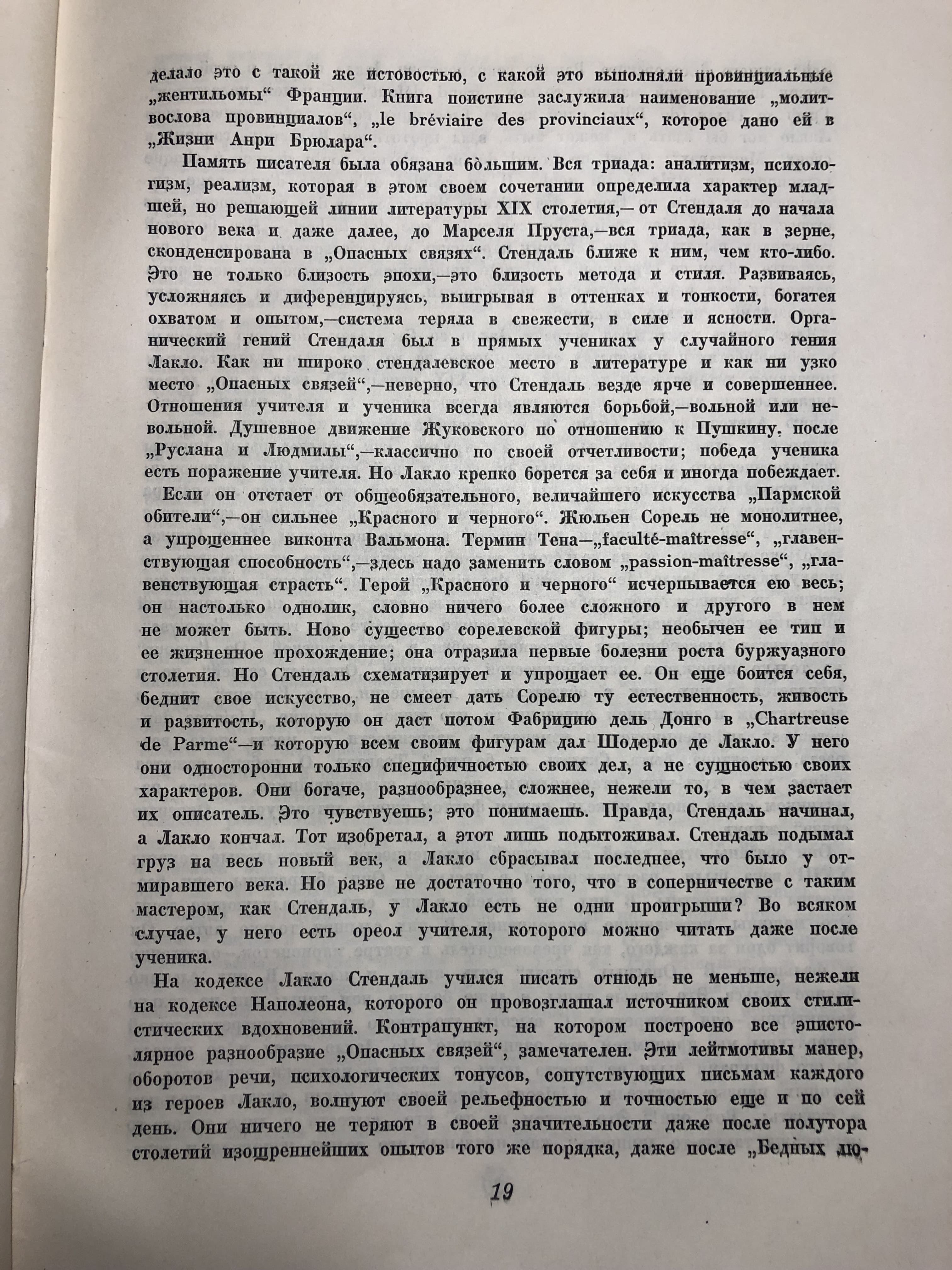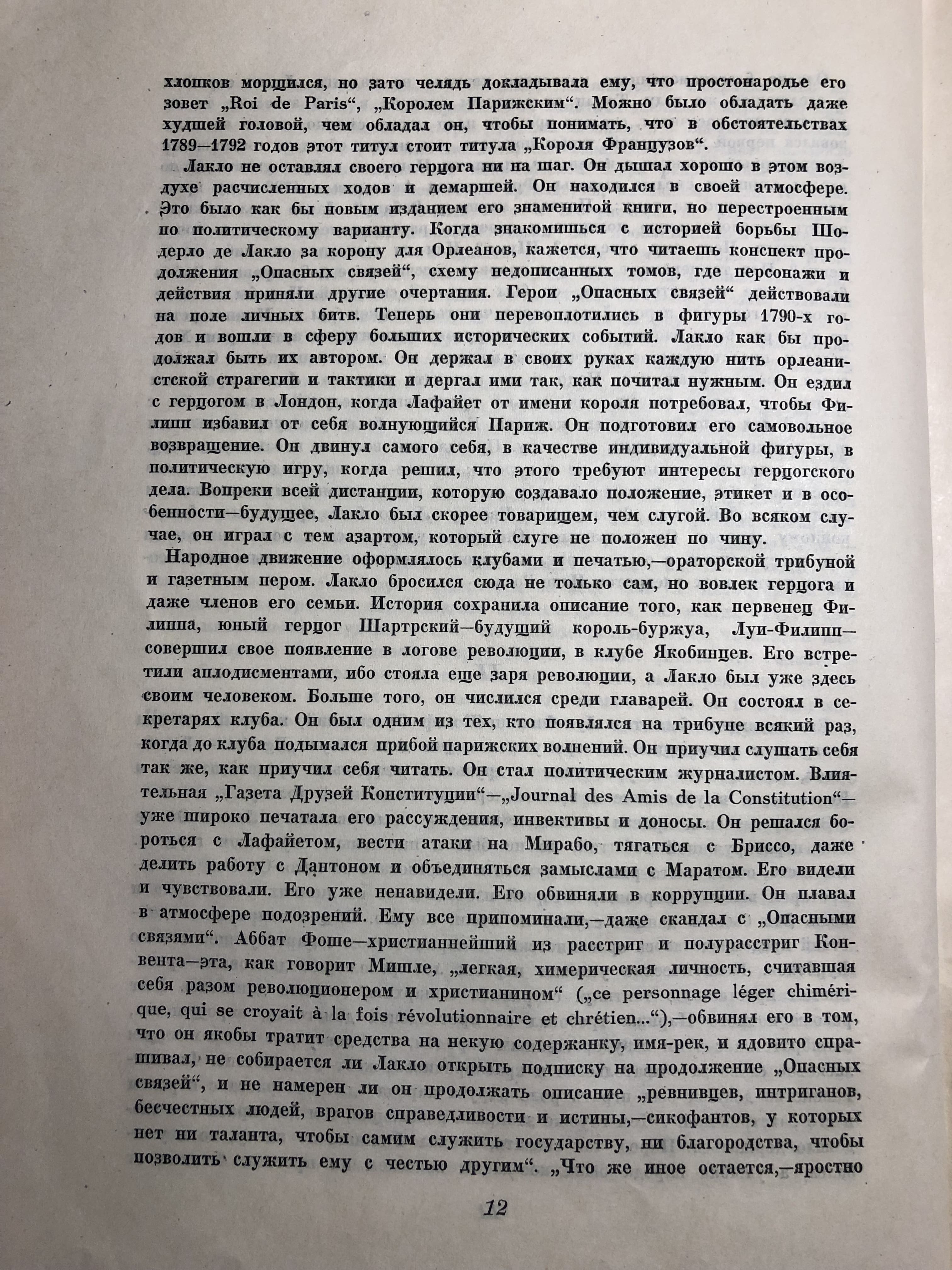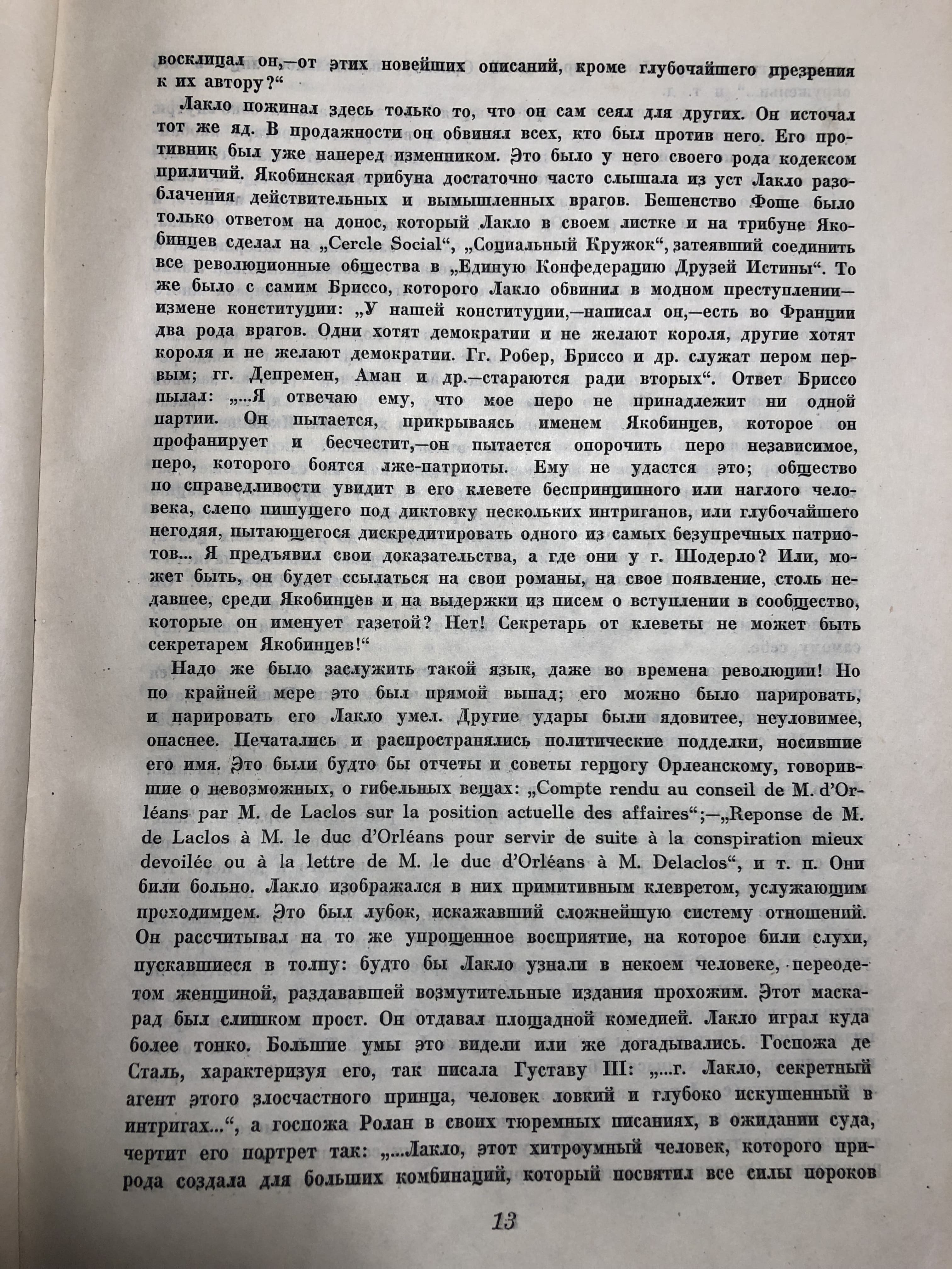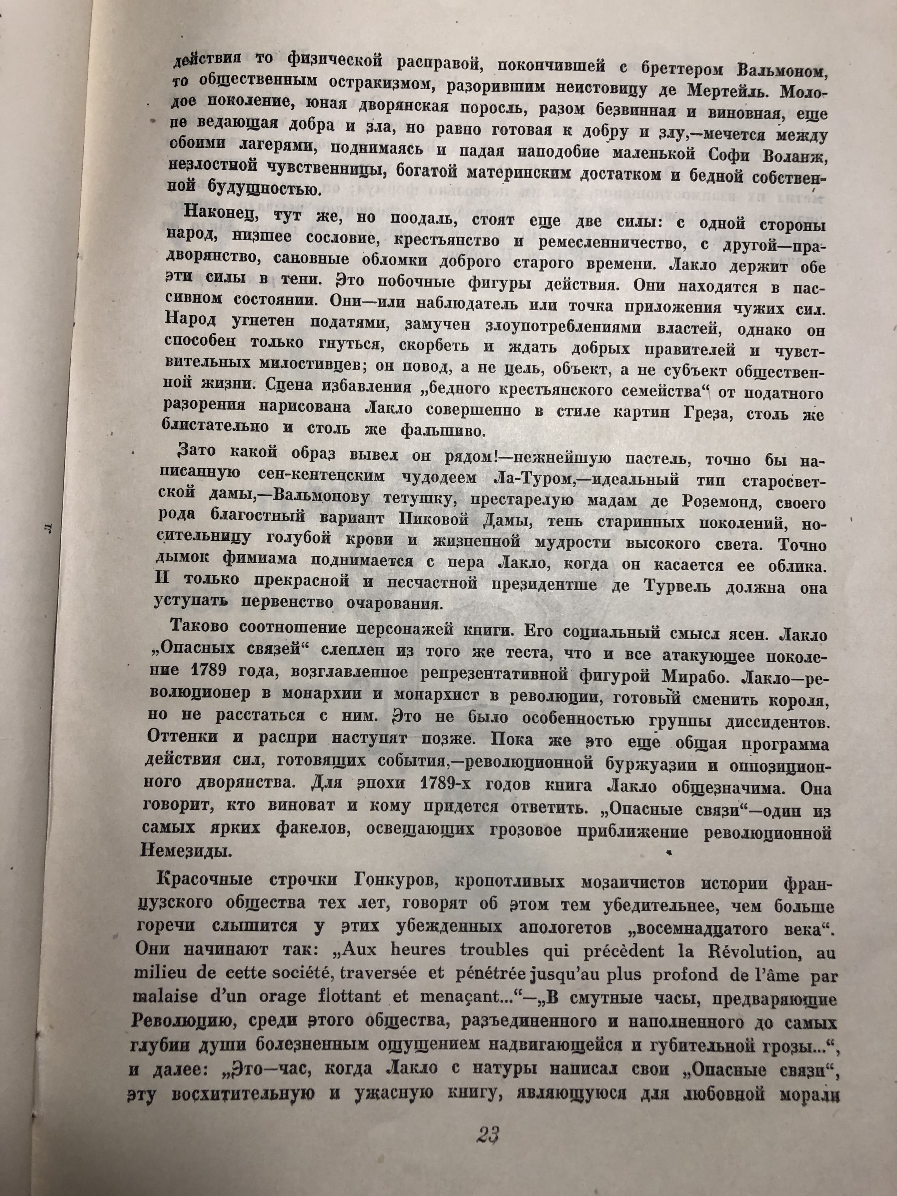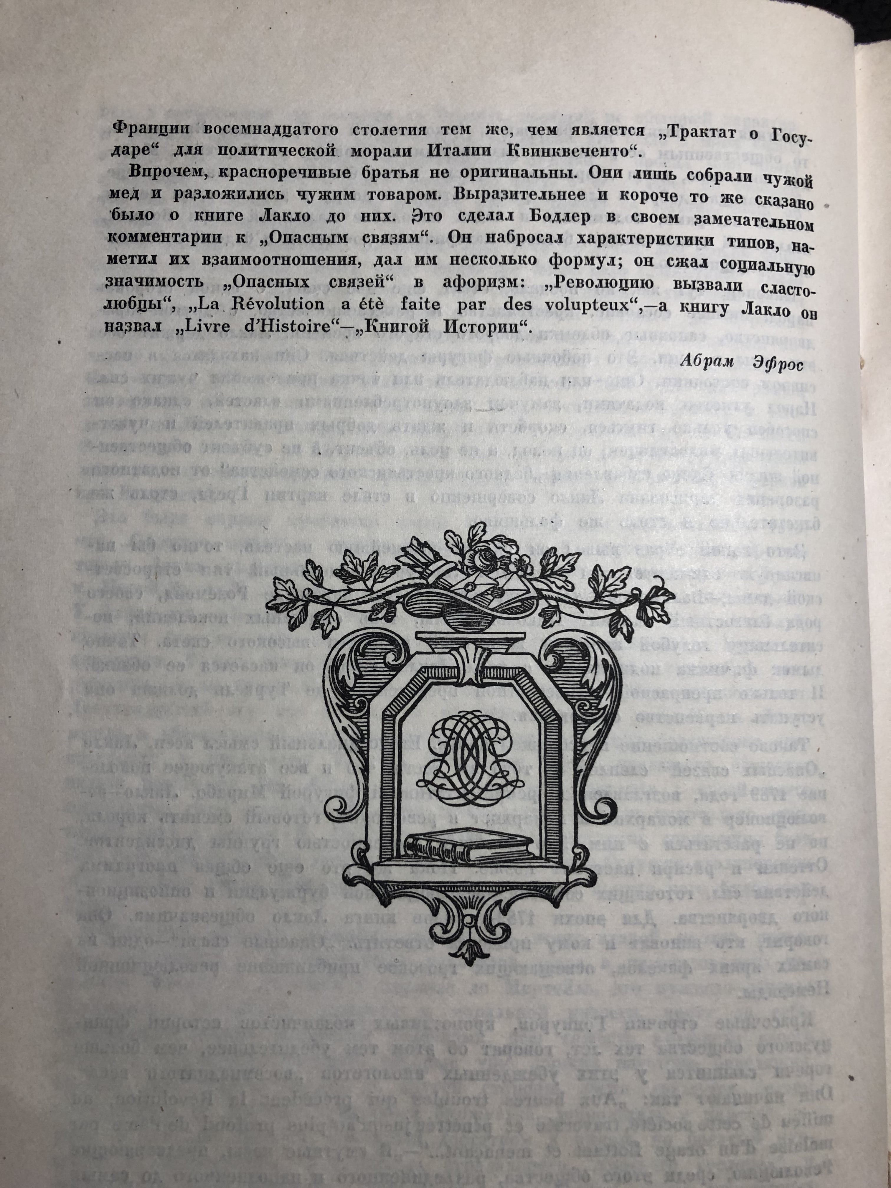 In his introduction, therefore, Efros essentially resorts to the biographical approach (already present indeed in the early 20th century French works of Émile Dard and Adolphe Van Bever, the latter published several times during the 1920s, to which Èfros probably had access thanks to his stay in Paris in 1927), and to the Marxist interpretation of the events of the novel’s characters, also included in the natural historical evolution that would lead from the Ancien régime to the bourgeois revolution; at the same time he purges his article of any reference to plot, love-strategy, or the erotic-sentimental novel (it was preferable not to do so, given the predictable negative judgement – in terms of the Marxist approach – to all that is aesthetisation or literary representation of eros – D019), and this too, we note, is an undeniable talent in the packaging of useful and virtuosic literary reticence (we could speak of a peculiar technique of Omission operated by the most audacious – or powerful – of the authors of these Stalinist paratexts). Efros then concludes with a seductive aphorism from Beaudelaire: “Революция была сделана сластолюбцами” (“la Révolution a étée faite par des voluptueux”), which allows him to claim that Laclos’s novel is a true ‘history book’.